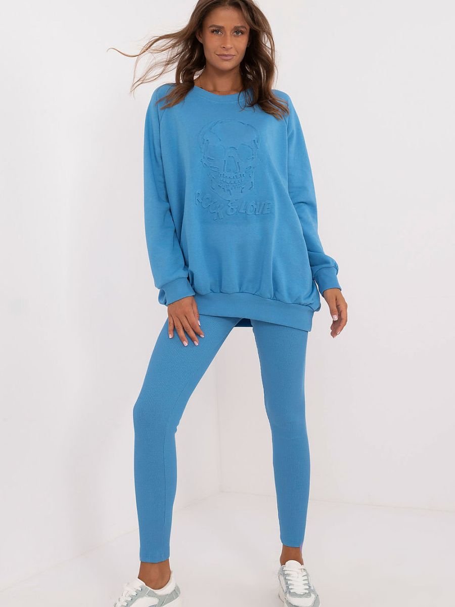 Damski komplet składający się z legginsów i bluzy, idealny na codzienne, casualowe stylizacje. Wykonany z wysokiej jakości bawełny z dodatkiem elastanu, zapewnia komfort noszenia i dopasowanie do sylwetki. Legginsy o zwężanych nogawkach, z prążkowanego materiału i wysokim stanem, podkreślają figurę, jednocześnie oferując wygodę i swobodę ruchów. Bluza z długimi rękawami oraz okrągłym dekoltem wyróżnia się wytłaczanym obrazem na przodzie, dodając zestawowi oryginalnego charakteru. Gładki wzór dominuje w całym komplecie, czyniąc go uniwersalnym wyborem na każdą codzienną okazję.