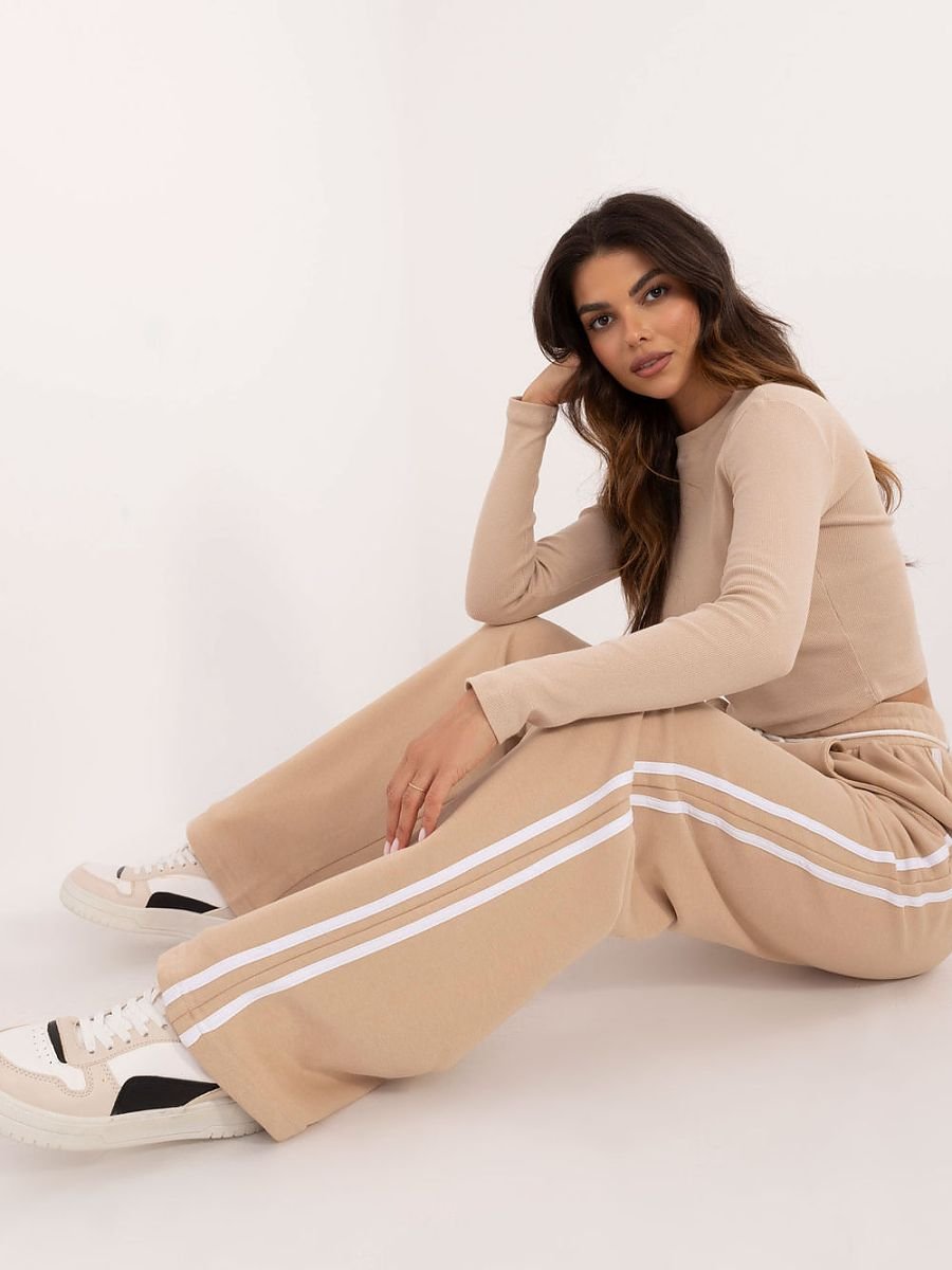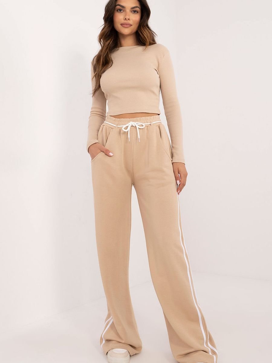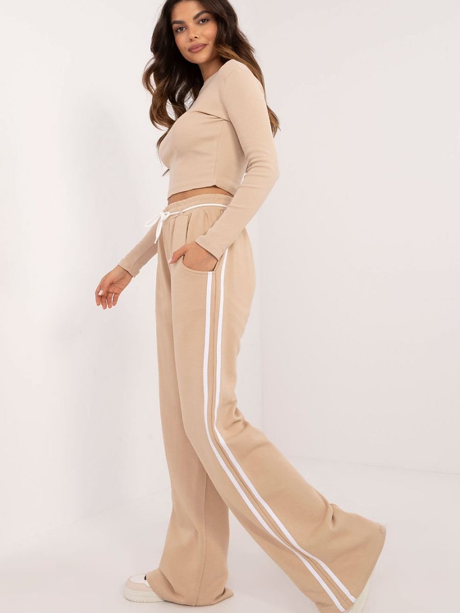 Damski komplet w stylu casualowo-sportowym, idealny na codzienne okazje. Wykonany z mieszanki bawełny i elastanu, zapewnia komfort i elastyczność. Gładki wzór oraz prążkowany materiał bluzki dodają nowoczesnego charakteru. Bluzka ma długi rękaw i okrągły dekolt, doskonale dopasowując się do sylwetki. Spodnie o szerokich, długich nogawkach, z wysokim stanem oraz bocznymi, wsuwanymi kieszeniami, gwarantują wygodę i praktyczność. Całość uzupełniają lampasy wzdłuż nogawek, nadające sportowy akcent. To stylowy wybór na co dzień, łączący modę i wygodę.