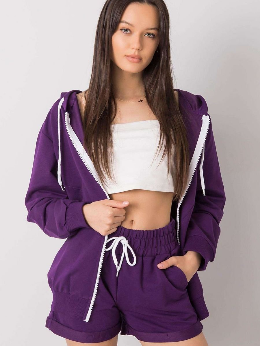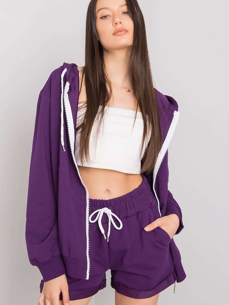 Komplet dresowy składający się z bluzy i szortów. Bluza zapinana na zamek, z kapturem. Szorty z gumką i wiązanie w pasie, po bokach kieszenie wsuwane.