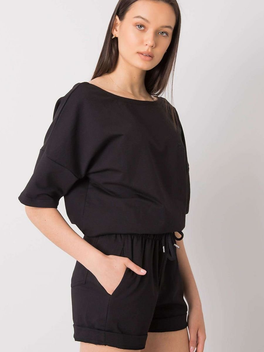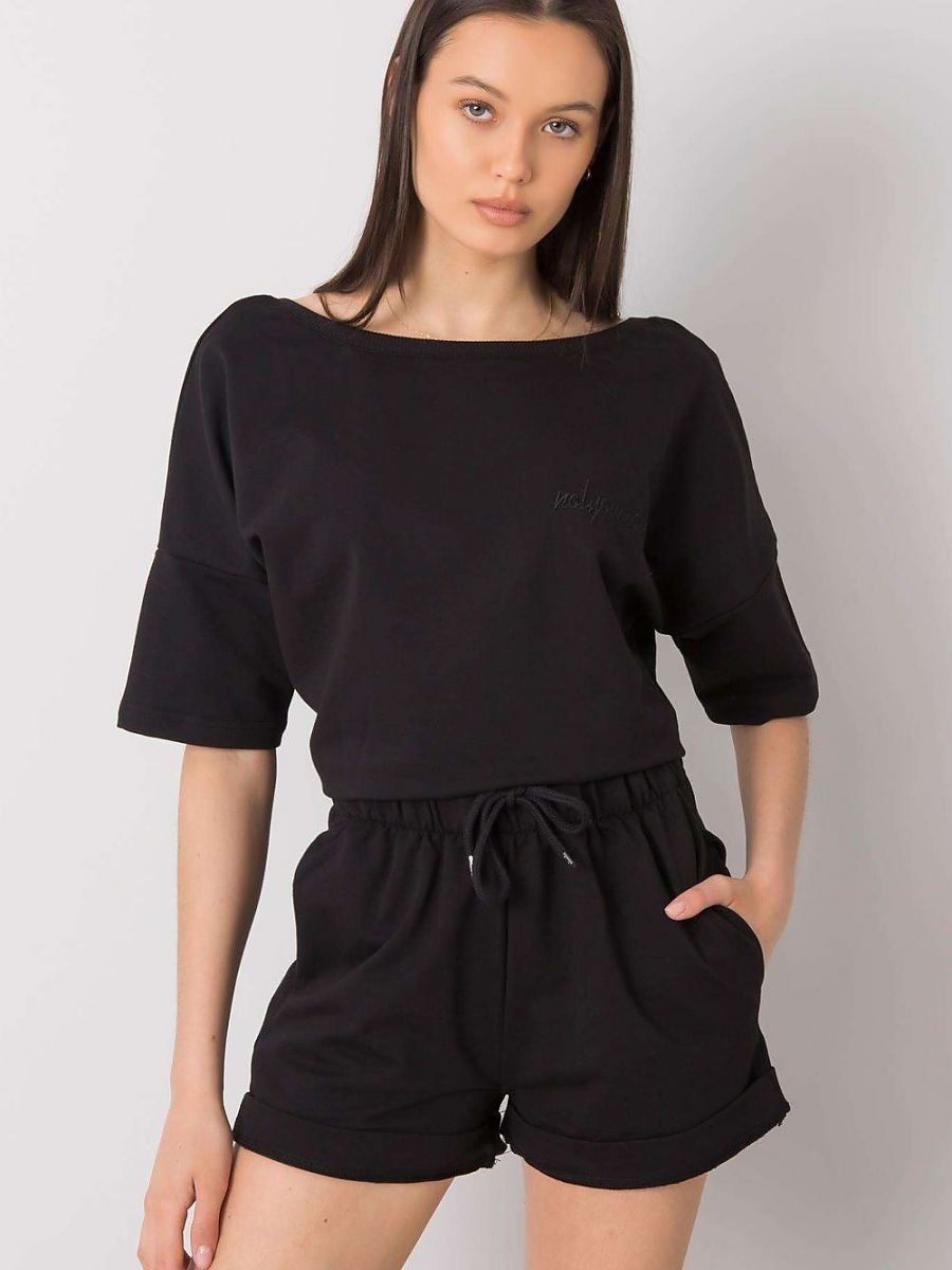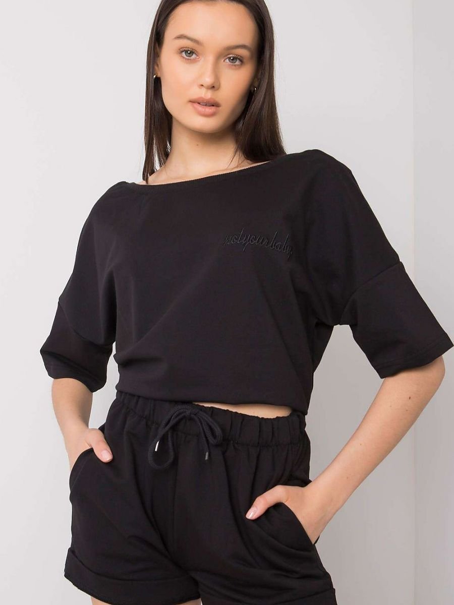 Bawełniany komplet składający się z bluzki i spodenek. Bluzka o luźnym kroju z krótkim rękawkiem. Szorty z gumką i wiązanie w pasie. Po bokach kieszenie wsuwane.