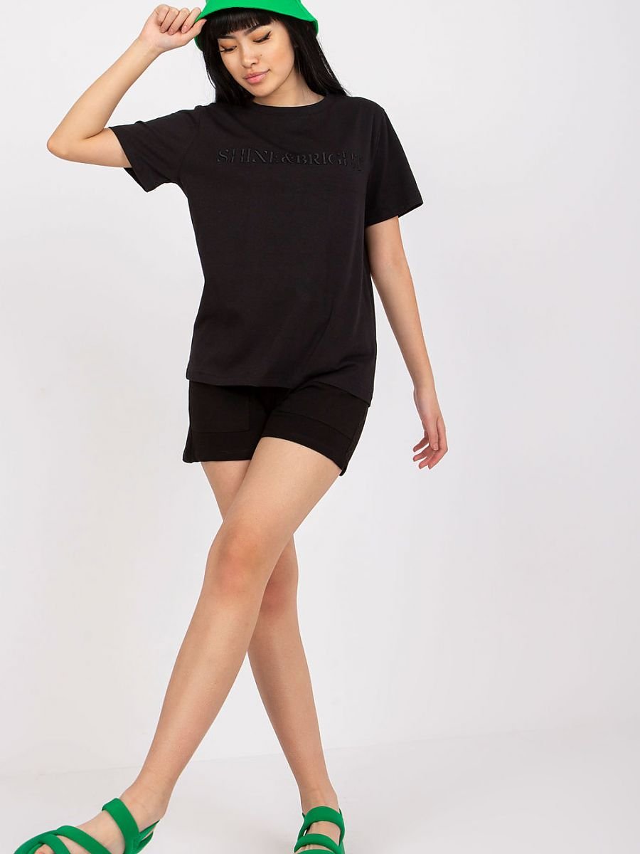 Komplet składający się z bluzki i szortów. Bluzka z krótkim rękawem, na przodzie napis. Szorty z troczkiem do wiązania, po bokach kieszenie wsuwane.