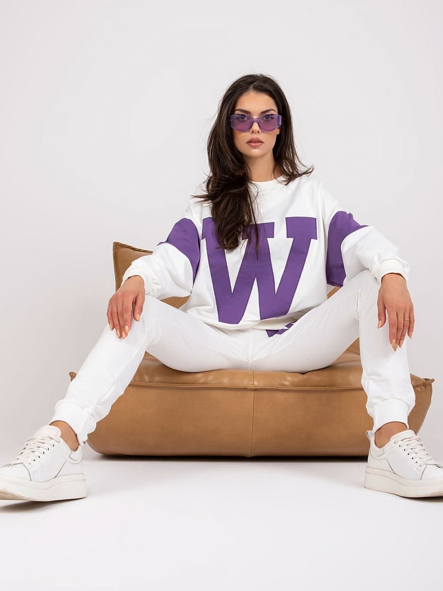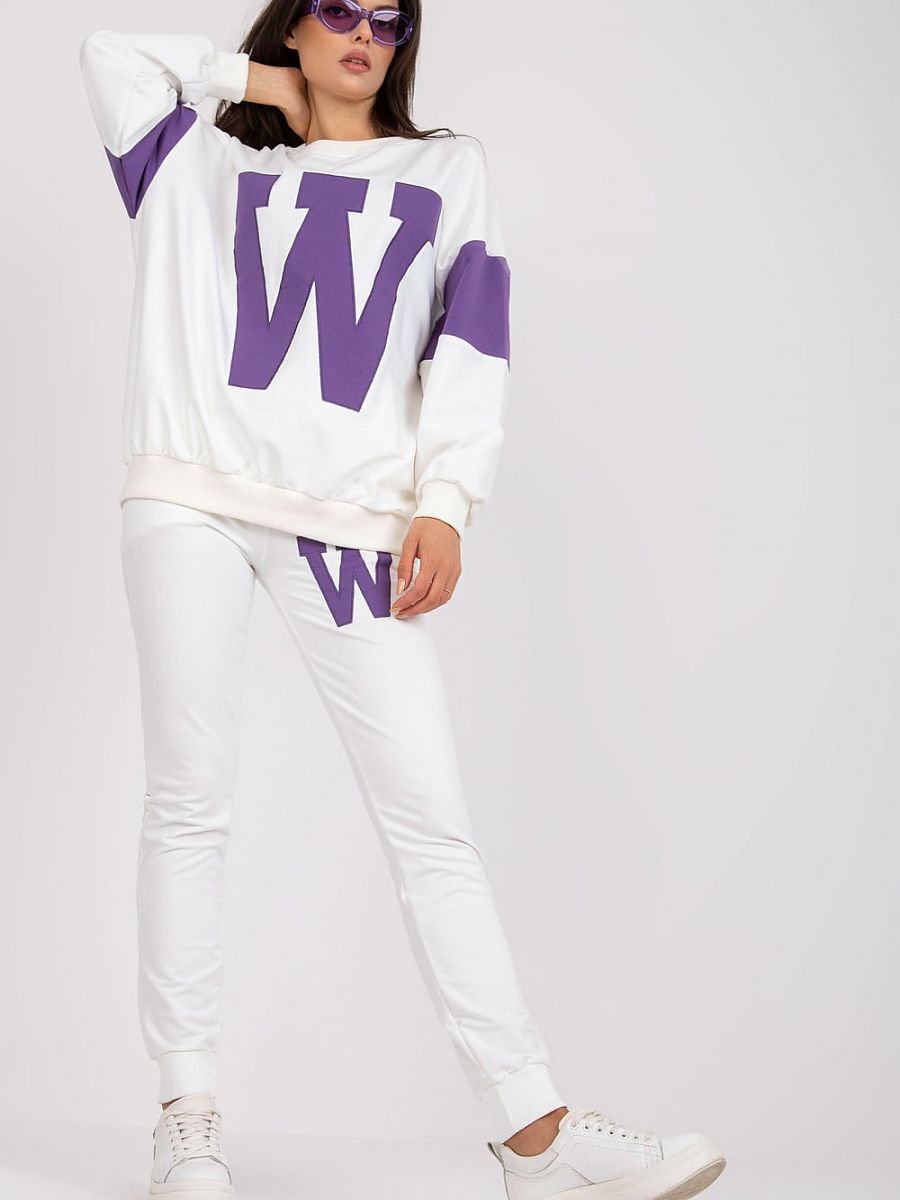 Dresowy komplet damski składający się z bluzy oraz długich spodni. Bluza o luźnym kroju, z długim rękawem. Długie spodnie o dopasowanym kroju, w pasie troczki do wiązania, po bokach kieszenie wsuwane.
