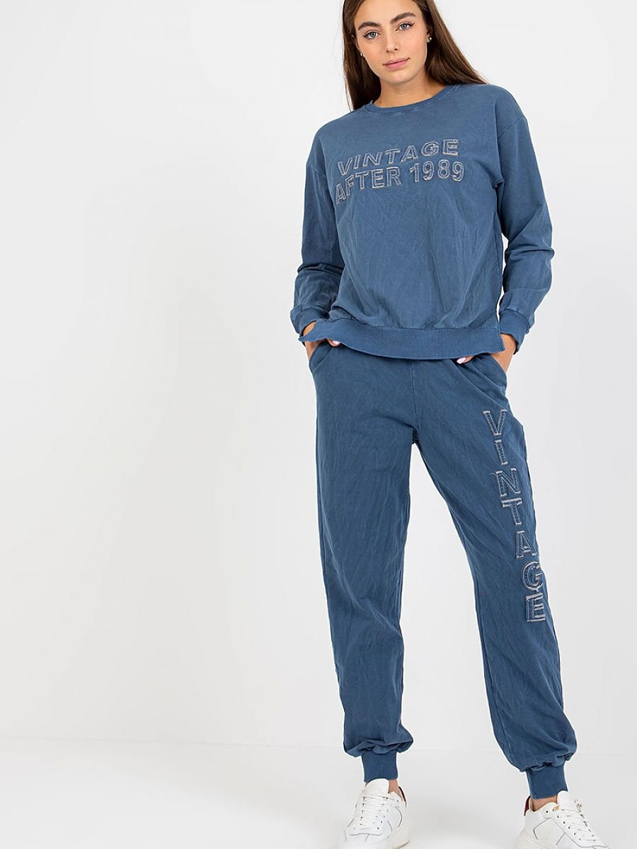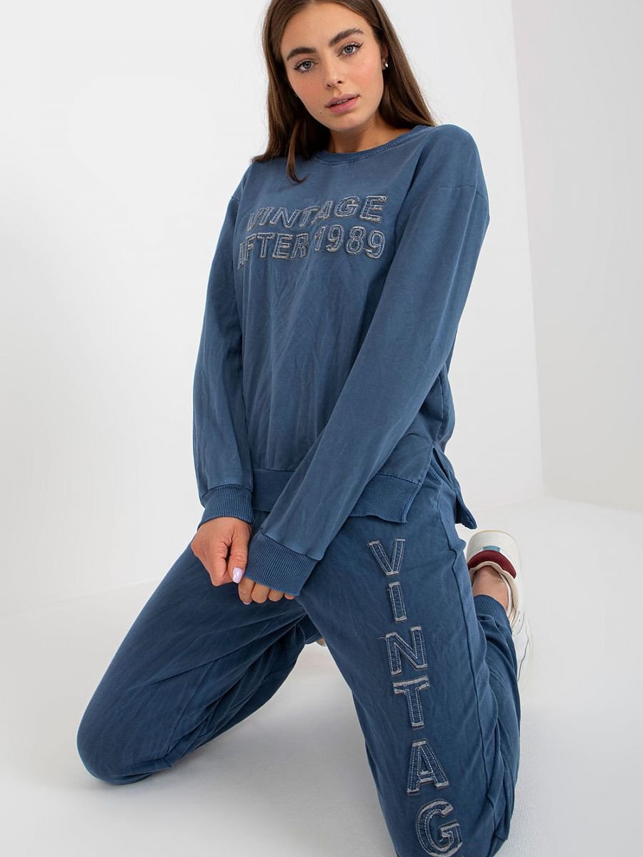 Komplet dresowy damski składający się z bluzy oraz spodni. Bluza o luźnym kroju z długim rękawem oraz ozdobnym napisem na przodzie. Długie spodnie z gumą w pasie, po bokach kieszenie wsuwane.