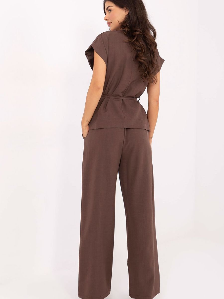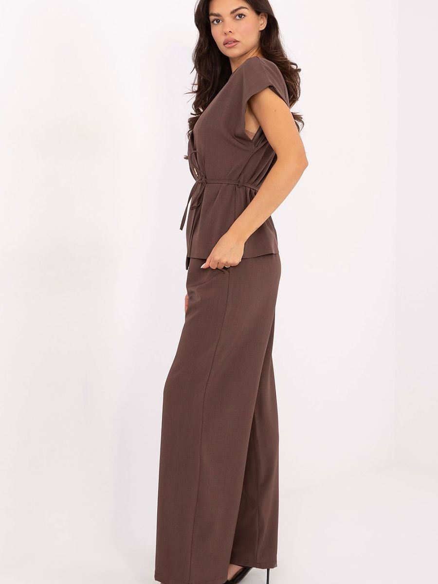 Elegancki komplet damski składający się z kamizelki i spodni, doskonały na co dzień, do pracy oraz na wizytowe okazje. Wykonany z mieszanki wiskozy i poliestru, wyróżnia się gładką strukturą i klasycznym charakterem. Kamizelka zapinana na guzik posiada krótki, kopertowy rękaw oraz wiązanie w pasie, które podkreśla sylwetkę i dodaje kobiecego uroku. Spodnie o wysokim stanie z wszytą gumą w pasie gwarantują wygodę, a szerokie nogawki nadają lekkości i elegancji. Boczne wsuwane kieszenie sprawiają, że komplet łączy styl z funkcjonalnością, tworząc nowoczesną i ponadczasową całość.