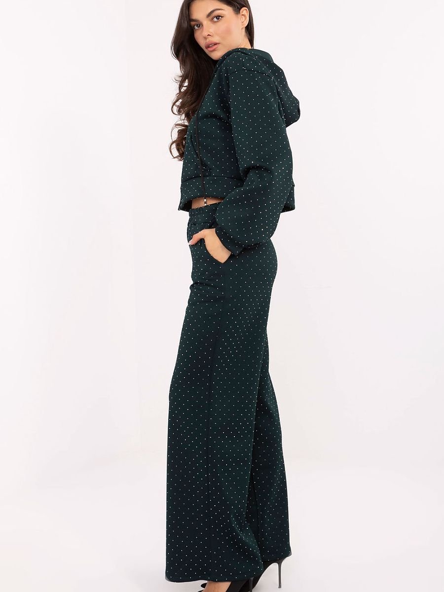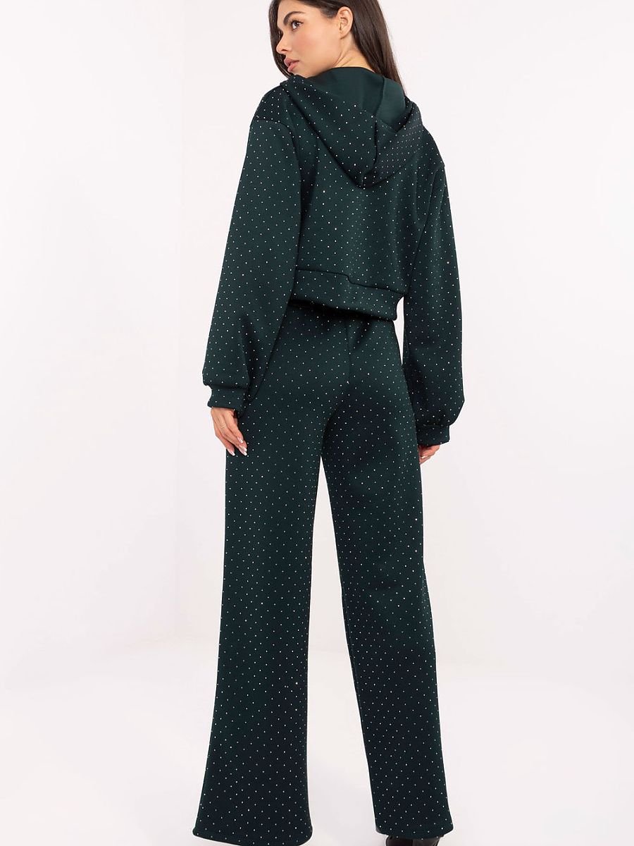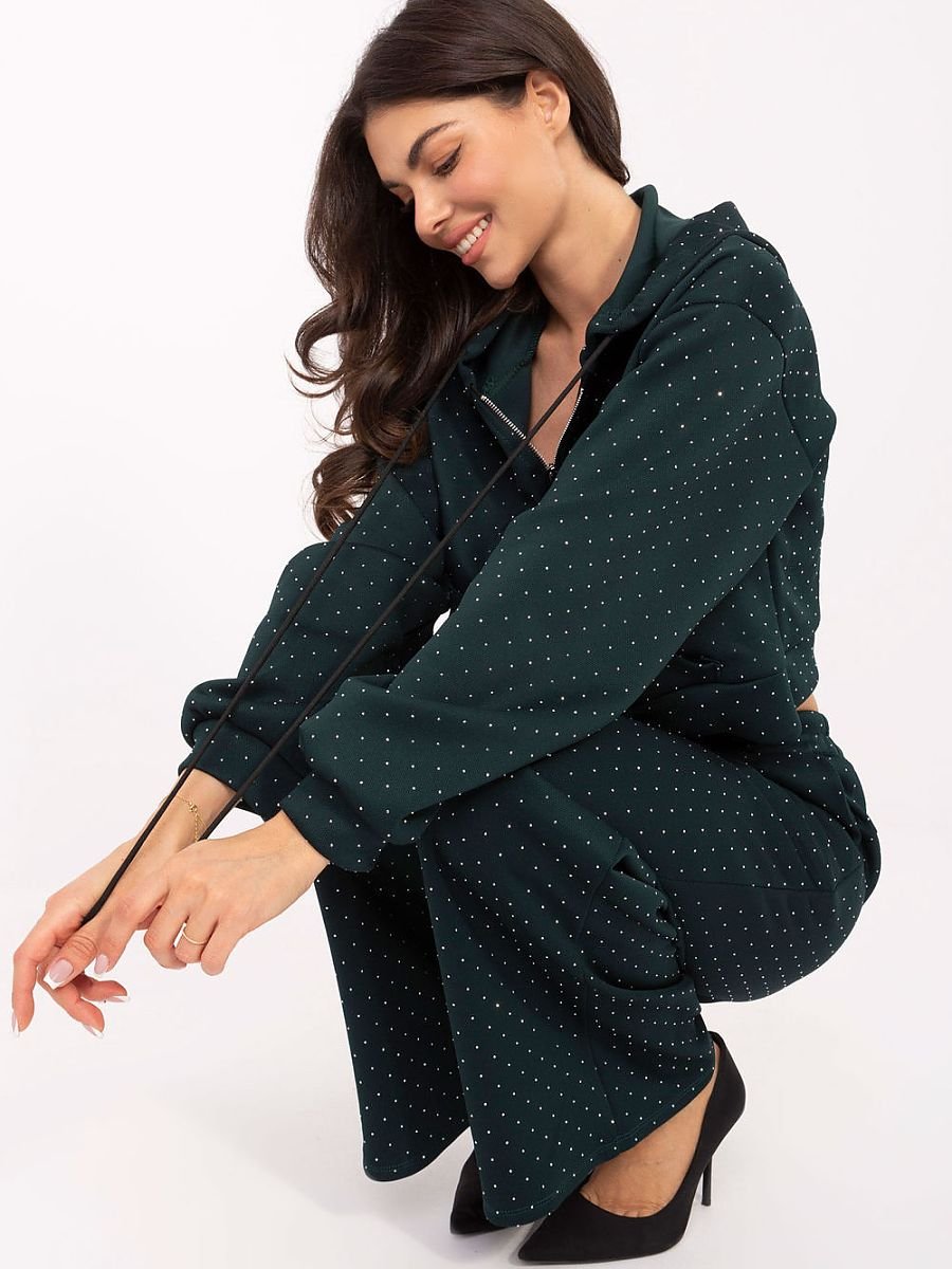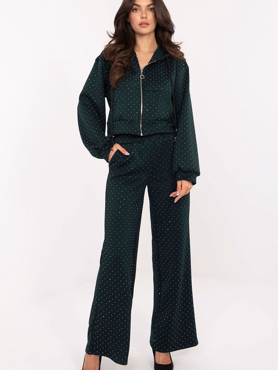 Stylowy i wygodny damski komplet dresowy to idealne połączenie elegancji i komfortu na co dzień. Zestaw składa się z bluzy zapinanej na zamek z kapturem i troczkami oraz spodni z gumką w pasie, tworząc modną, a zarazem praktyczną całość. Model został wykonany z wysokiej jakości mieszanki wiskozy i poliestru o urozmaiconej fakturze materiału, która pięknie się układa i zapewnia komfort noszenia. Całą powierzchnię zdobi efektowna aplikacja z dżetów, nadająca kompletowi eleganckiego charakteru i subtelnego blasku. Spodnie z wysokim stanem, szerokimi, długimi nogawkami oraz bocznymi, wsuwanymi kieszeniami gwarantują wygodę i swobodę ruchów. Bluza z długim rękawem doskonale dopełnia całość, czyniąc zestaw idealnym na codzienne stylizacje, od luźnych wyjść po spotkania w eleganckim, miejskim stylu. Ten komplet to połączenie komfortu dresu i wyrafinowanego wyglądu, które pozwoli Ci wyglądać modnie i czuć się swobodnie w każdej sytuacji.