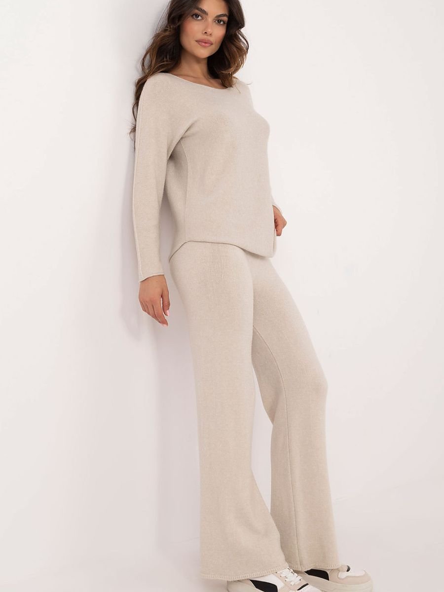 Casualowy komplet damski swetrowy, składający się ze swetra i spodni, to idealna propozycja na co dzień. Wykonany z miękkiej i przyjemnej w dotyku mieszanki wiskozy, poliestru i nylonu, zapewnia komfort oraz trwałość. Sweter o klasycznym kroju ma okrągły dekolt i długie rękawy, dzięki czemu jest praktyczny i wygodny w noszeniu. Spodnie z wysokim stanem i długimi, szerokimi nogawkami gwarantują swobodę ruchów oraz nowoczesny, stylowy wygląd. Gładki wzór sprawia, że komplet jest uniwersalny i łatwo dopasowuje się do różnych dodatków. To doskonały wybór dla kobiet ceniących połączenie wygody z ponadczasową prostotą.