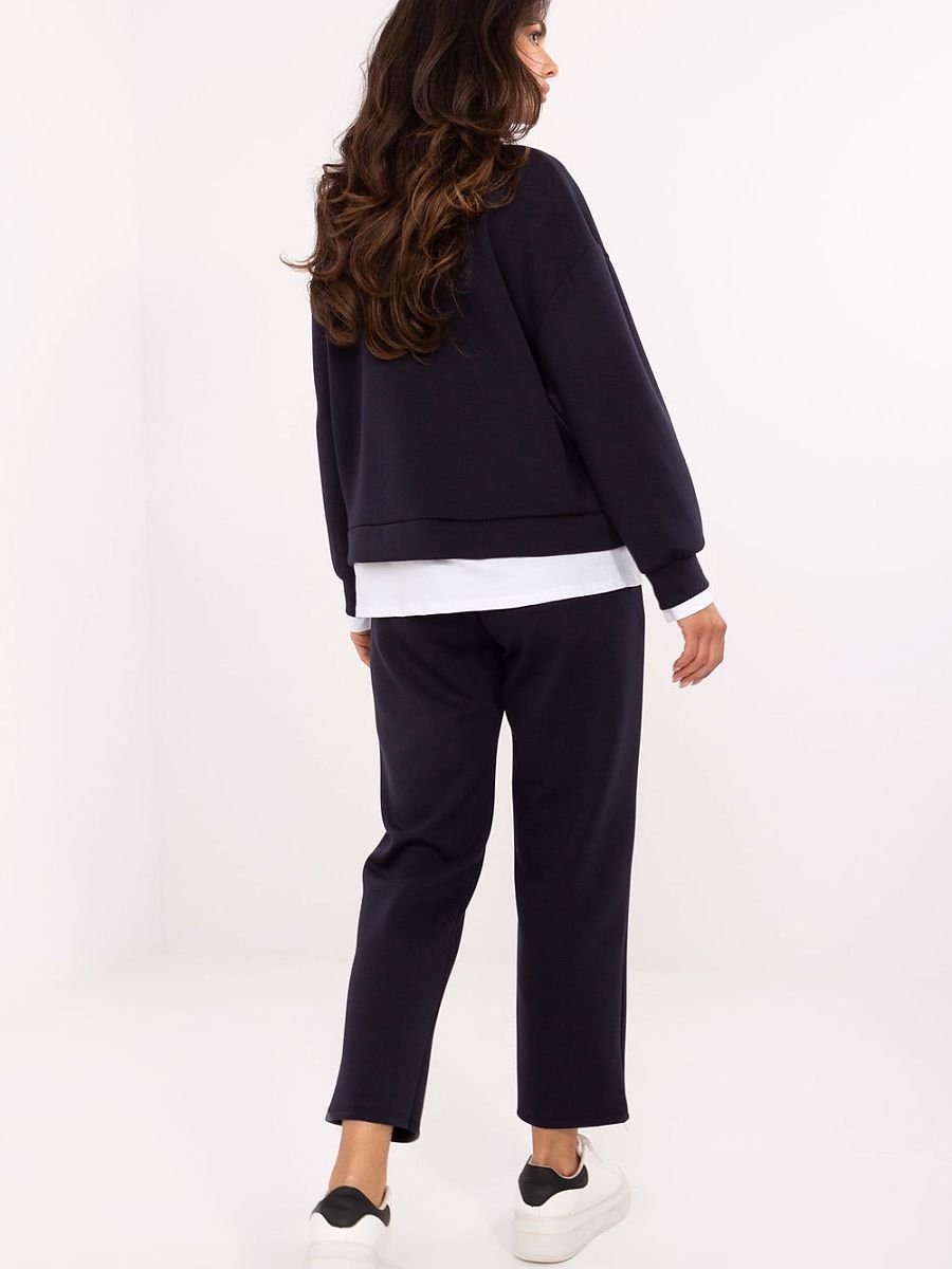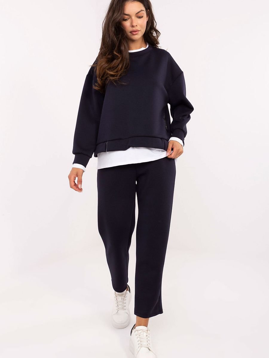 Damski komplet casual wykonany z materiału typu masełko miękki, delikatny i wyjątkowo przyjemny w dotyku. Zestaw składa się z bluzy z okrągłym dekoltem i spodni z wysokim stanem, tworząc komfortową i stylową stylizację na co dzień. Bluza posiada długi rękaw, dekolt i dół podszyte kontrastową tkaniną oraz subtelną naszywkę. Spodnie o prostych nogawkach wyposażone w wysoki pas z wiązaniem i boczne kieszenie, zapewniają wygodę i nowoczesny fason. Gładki wzór i połączenie wiskozy z elastanem gwarantuje miękkość, elastyczność i swobodę ruchów. To komplet idealny na codzienne wyjścia, który łączy komfort, elegancję i casualowy styl.