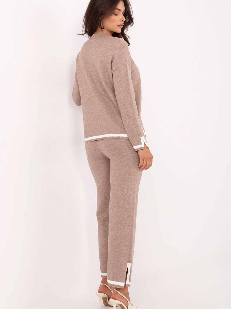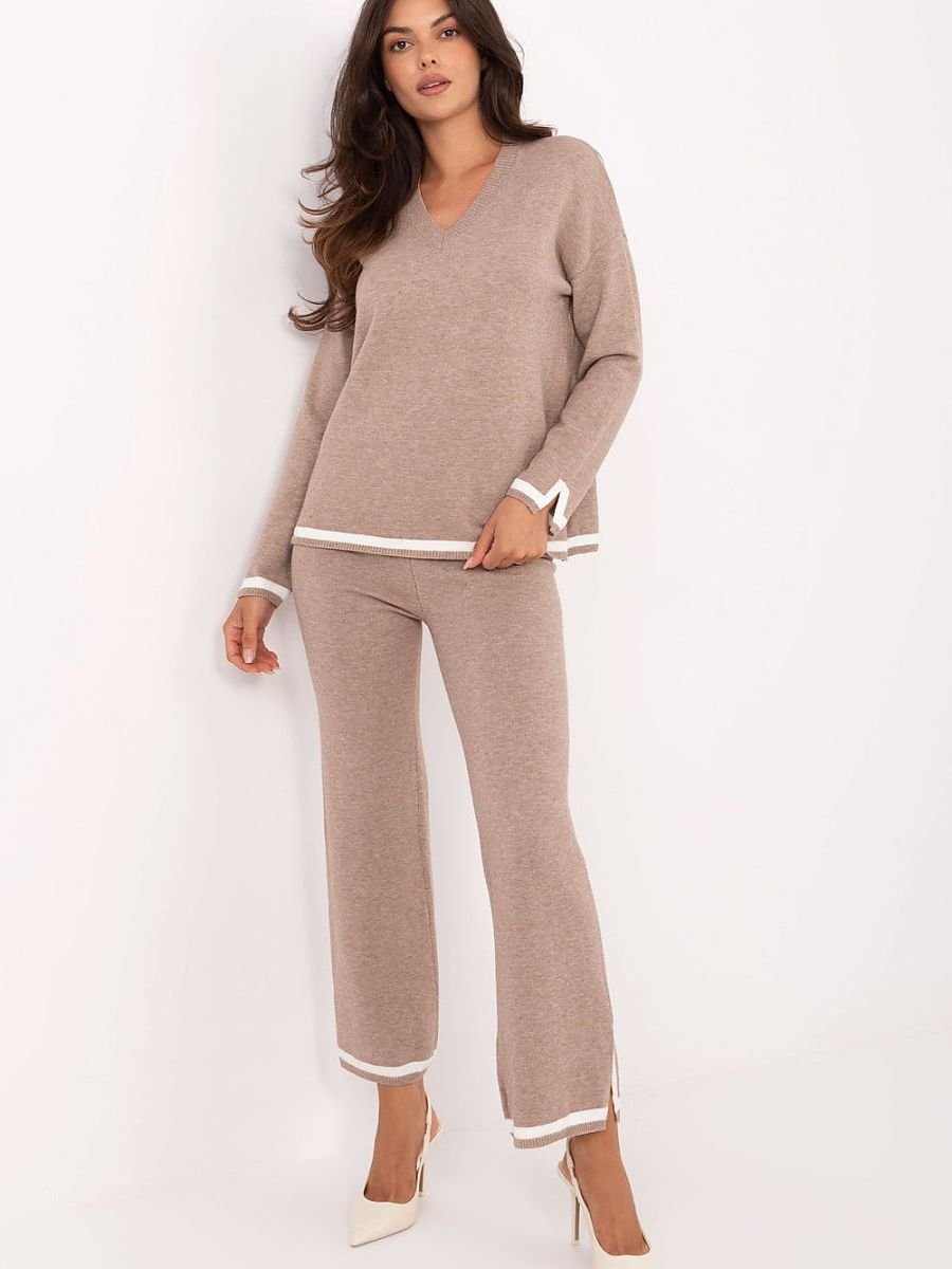Casualowy komplet damski swetrowy składający się ze swetra i spodni, stworzony z myślą o codziennym komforcie i nowoczesnym stylu. Wykonany z miękkiej mieszanki wiskozy, poliestru i nylonu, zapewnia wygodę noszenia oraz trwałość. Sweter z dekoltem w serek i długim rękawem wyróżnia się kontrastowym wykończeniem oraz modnymi rozcięciami u dołu i na mankietach, co dodaje mu lekkości i charakteru. Spodnie z wysokim stanem oraz długimi nogawkami zakończonymi subtelnymi rozcięciami idealnie komponują się ze swetrem, tworząc spójną i stylową całość. Gładki wzór oraz kontrastowe detale sprawiają, że komplet łączy w sobie prostotę z nutą oryginalności, doskonały wybór na co dzień dla kobiet ceniących wygodę w modnym wydaniu.