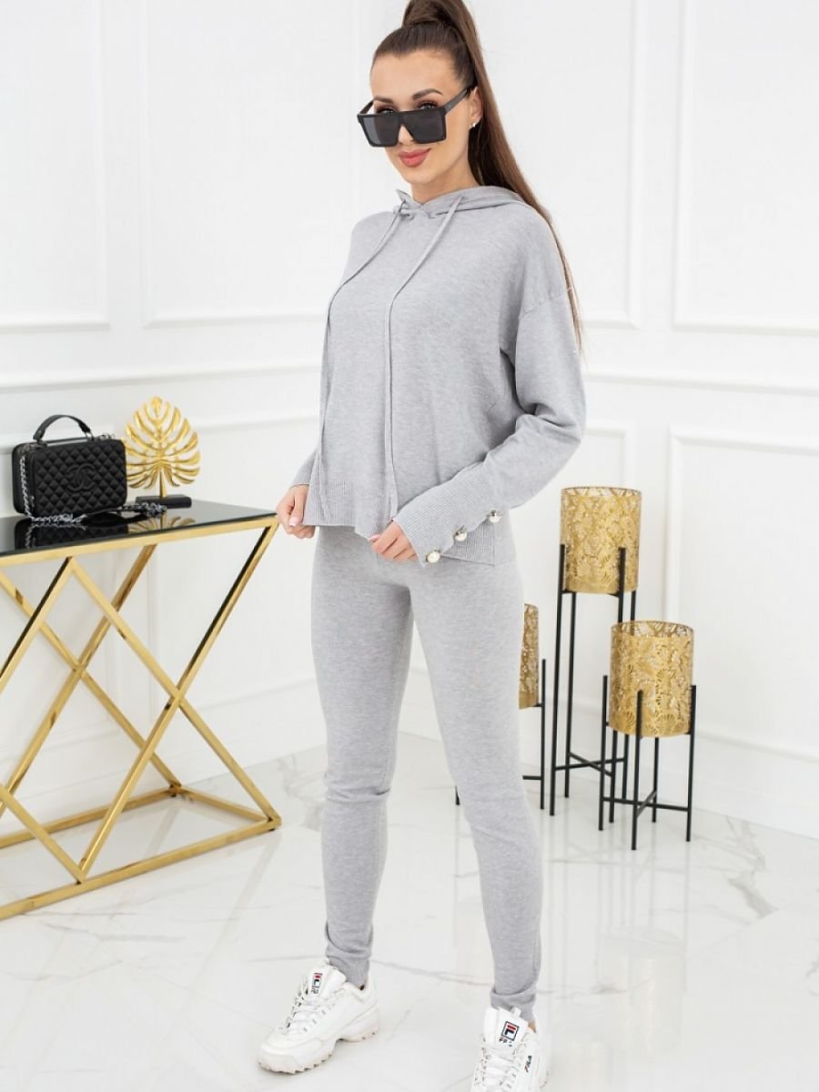 Co jeśli nie dres? śmiało wybierz miękki, dwuczęściowy zestaw z leginsami, najlepiej w świetnym, modnym kolorze. Kim Peral Buttons to ciekawa propozycja, w której komfortowo zrelaksujesz się na fotelu. Co Cię tu przywita? z pewnością wygodna, przyjemna w dotyku, elastyczna dzianina, zgrabny,  niesamowicie kobiecy styl i urocze, ozdobne guziki na rękawach. Bluzka z kapturem, rękawy i nogawki wykończone miękkimi ściągaczami.
