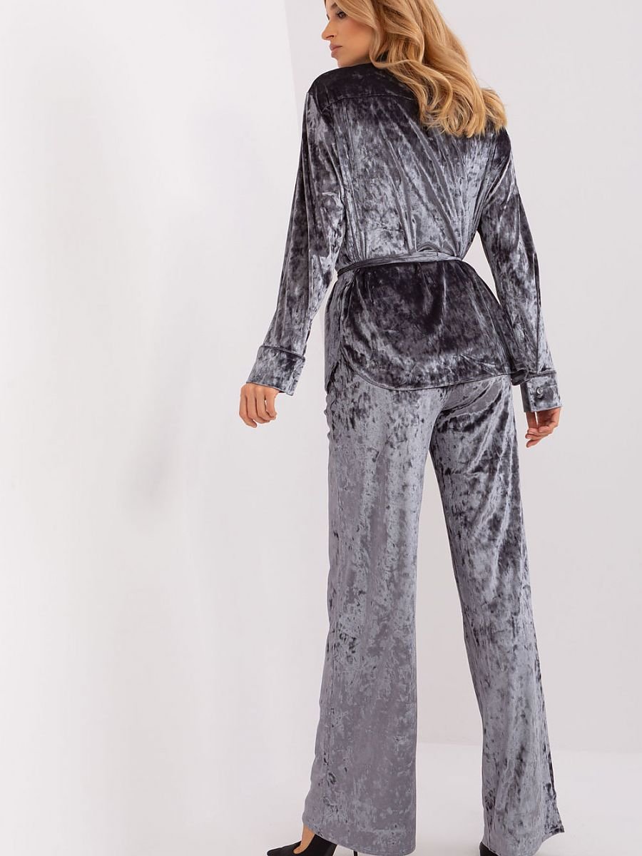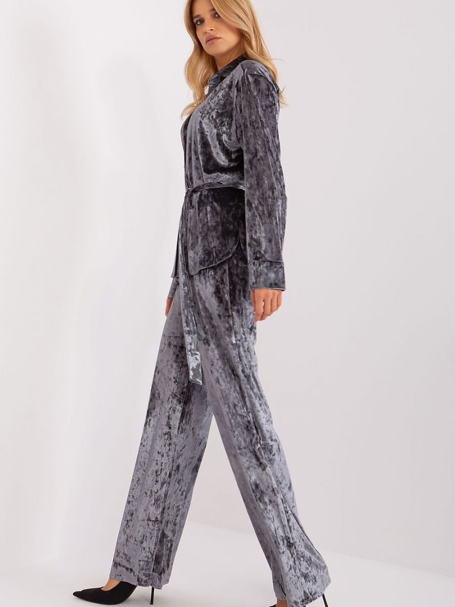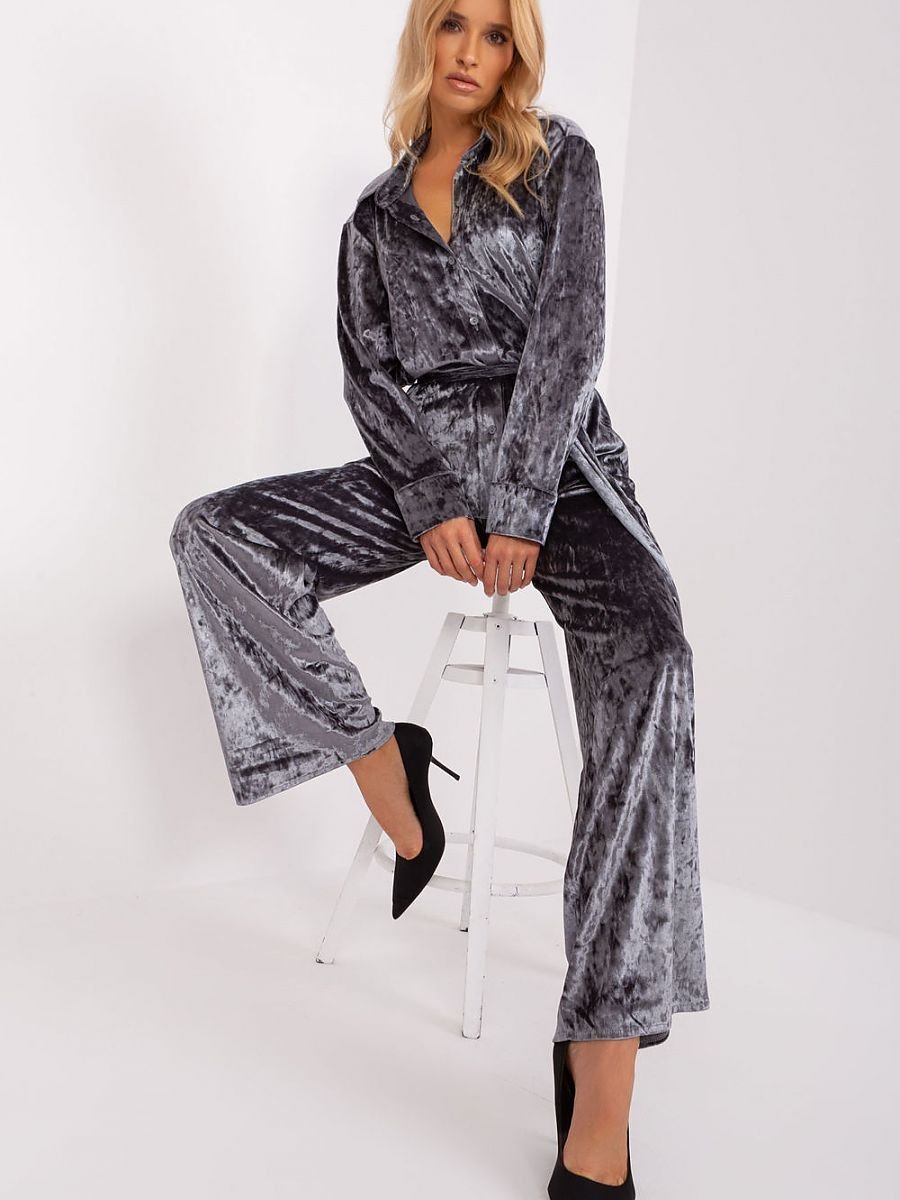 Ten komplet welurowy to synonim casualowego komfortu i stylu. Koszula, zapinana na guziki, emanuje luzem i swobodą, idealna na codzienne noszenie. Wykonana z przyjemnej w dotyku weluru, koszula zapewnia uczucie miękkości i swobody. Spodnie, także wykonane z weluru, mają szerokie nogawki, co podkreśla casualowy charakter zestawu. Wysoki pas z elastyczną gumą zapewnia nie tylko wygodę noszenia, ale również nadaje oryginalny wygląd. Dodatkowo, spodnie posiadają praktyczne kieszenie boczne, umożliwiające wygodne przechowywanie drobiazgów. Całość dopełnia pasek do wiązania, który nie tylko jest praktycznym dodatkiem, ale także nadaje kompletności stylizacji. To idealny zestaw dla kobiet ceniących wygodę i swobodę, jednocześnie nie rezygnujących z modowego wyrazu nawet w codziennych sytuacjach.