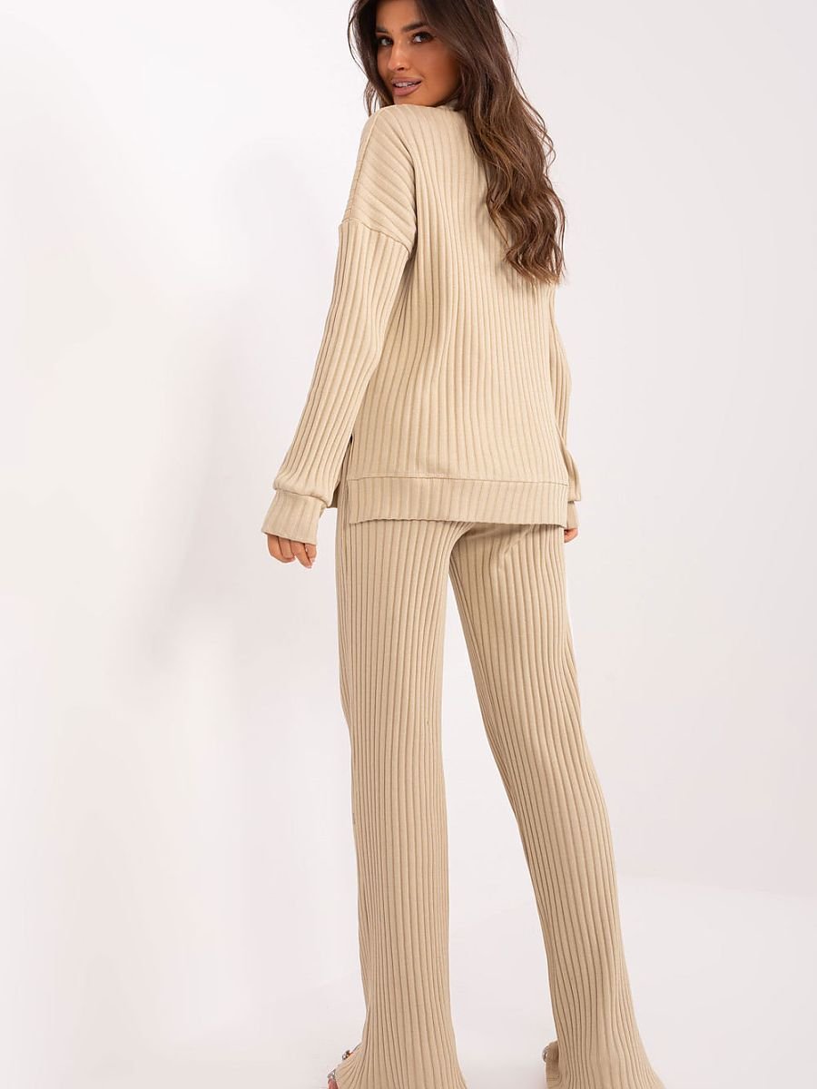 Wygodny i stylowy komplet damski z materiału prążkowanego, doskonały na co dzień oraz do pracy. Wykonany z wysokiej jakości bawełny z dodatkiem elastanu, zapewnia komfort noszenia, elastyczność i idealne dopasowanie do sylwetki. Gładka faktura w połączeniu z prążkowaniem nadaje mu subtelny, nowoczesny charakter. Bluza o luźnym kroju posiada długi rękaw i klasyczny okrągły dekolt, co sprawia, że jest uniwersalna i wygodna. Spodnie z wysokim stanem i szerokimi nogawkami gwarantują swobodę ruchów, a boczne wsuwane kieszenie dodają funkcjonalności. To doskonały wybór dla kobiet ceniących casualowy styl, wygodę i modny wygląd!
