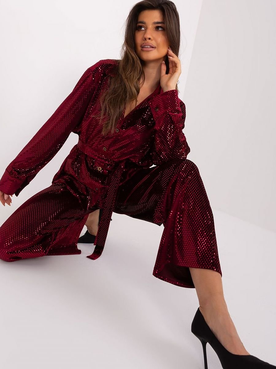 Komplet elegancki składający się z koszuli i spodni to doskonały wybór na wyjątkowe okazje, takie jak imprezy czy wydarzenia wizytowe. Ta stylizacja emanuje luksusem i dbałością o detale, doskonale sprawdzając się w sytuacjach, gdzie elegancja jest kluczowa. Koszula, zapinana na guziki, prezentuje się niezwykle schludnie i klasycznie. Jej fason podkreśla sylwetkę, a wysoki kołnierzyk dodaje szyku. Długi rękaw sprawia, że komplet nadaje się również na chłodniejsze wieczory. Spodnie posiadają proste nogawki i wysoki stan, co nadaje im elegancki charakter. Długość standardowa sprawia, że są uniwersalne i pasują do różnych okazji. Dodatkowym elementem ozdobnym są wsuwane kieszenie boczne, które jednocześnie nadają spodniom funkcjonalność. Wzór dominujący to subtelne aplikacje w postaci cekinów, które dodają zestawowi blasku i wyjątkowości. Pasek do wiązania, będący częścią kompletnego zestawu, podkreśla talię, nadając całości eleganckiego wykończenia. Ten elegancki komplet sprawdzi się doskonale na imprezy czy wizytowe okazje, prezentując noszącą w sposób wyjątkowo stylowy i zmysłowy. To połączenie klasycznej elegancji z subtelnym akcentem modowej świeżości.