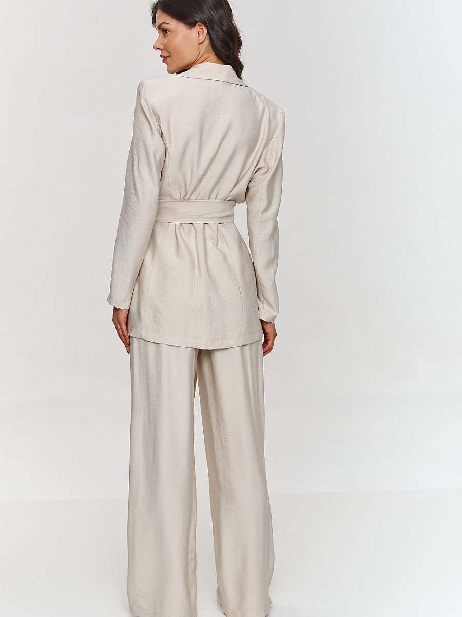 Ten damski komplet został zaprojektowany z myślą o kobietach, które szukają połączenia stylu, wygody i nowoczesnej elegancji. Marynarka o dłuższym luźnym kroju, nadaje stylizacji nowoczesny charakter a wiązany pasek pozwala na dopasowanie do sylwetki podkreślając linię talii. Nie posiada podszewki co czyni ją lżejszą i swobodniejszą. Spodnie o szerokich nogawkach podkreślają modny wygląd a elastyczny pas zapewnia maksymalny komfort. Model wykonany z lekkiego, strukturalnego materiału, który akcentuje jego wyjątkowość i klasę. Dodatkowym plusem jest możliwość noszenia każdego elementu oddzielnie tworząc różnorodne i oryginalne outfity. Dzięki prostej ale efektownej konstrukcji komplet jest doskonałym rozwiązaniem zarówno na wypady ze znajomymi jak i do biura, na spotkania biznesowe i inne formalne wyjścia gdzie chcesz wyglądać profesjonalnie jednocześnie nie rezygnując z wygody.