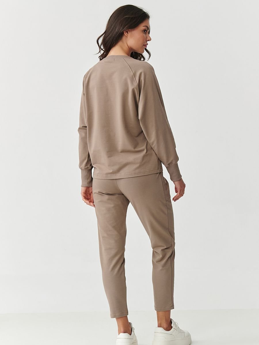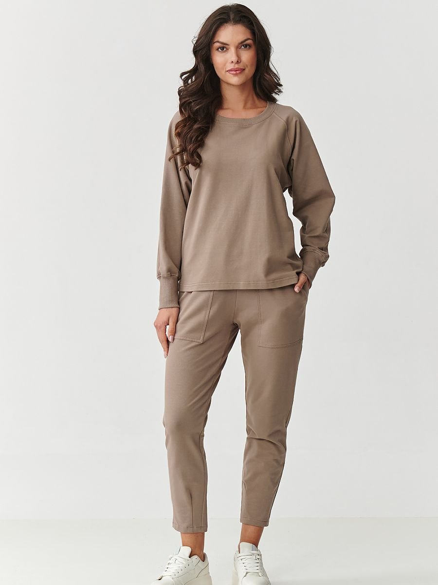 Wygodny i stylowy komplet dresowy damski to idealna propozycja dla kobiet ceniących komfort bez rezygnacji z modnego wyglądu. Uszyty z wysokiej jakości materiału, połączenia bawełny i elastanu zapewnia miękkość, elastyczność oraz trwałość, dzięki czemu świetnie sprawdzi się zarówno w domu, jak i na spacerze, zakupach czy w pracy. Bluza ma klasyczny, luźny krój z długimi rękawami wykończonymi ściągaczami, które dodają jej sportowego charakteru. Natomiast okrągły dekolt podkreśla jej uniwersalność. Klasyczne spodnie są wygodne, dzięki swobodnemu fasonowi i wyposażone w praktyczne duże kieszenie, które nie tylko świetnie wyglądają, ale też są niezwykle funkcjonalne. Dodatkowo na dole nogawek są zaszewki, dając efekt delikatnego zwężenia ku dołowi. Dres nie mechaci się, dobrze znosi pranie i zachowuje swój kształt, dzięki czemu będzie służył Ci przez wiele sezonów.