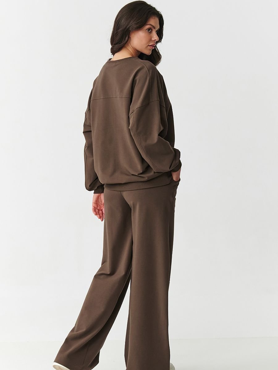 Postaw na połączenie wygody i modnego looku z damskim kompletem dresowym, który idealnie sprawdzi się zarówno na co dzień, jak i podczas luźnych wyjść czy relaksu w domu. Wykonany z miękkiej, oddychającej dzianiny o składzie 95% bawełna, 5% elastan, gwarantuje komfort noszenia i świetne dopasowanie do sylwetki bez krępowania ruchów. Górna część zestawu to klasyczna bluza z okrągłym dekoltem i delikatnie obniżoną linią ramion. Ma lekko oversizowy krój który nadaje stylizacji luzu i nowoczesnego charakteru. Jej wyjątkowość podkreśla haftowana aplikacja z logo na przodzie, która dodaje całości oryginalności i subtelnego stylu. Spodnie wyróżniają się modnym krojem z szerokimi nogawkami, które pięknie układają się w ruchu i nadają sylwetce lekkości oraz równoważą proporcję sylwetki. Elastyczny pas i praktyczne kieszenie zwiększają funkcjonalność i wygodę noszenia. Idealny wybór na każdą porę roku, dres z szerokimi nogawkami i haftem to must-have w kobiecej garderobie. Komfort, jakość i modny wygląd w jednym zestawie!