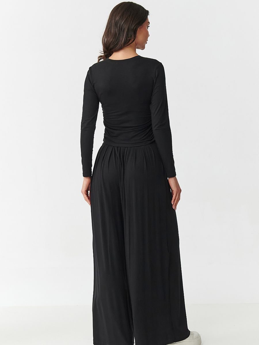 Ten komplet to idealna propozycja dla kobiet, które szukają połączenia wygody, stylu i delikatności. Wykonany z miękkiej, przyjemnej w dotyku wiskozy, idealnie dopasowuje się do sylwetki, zapewniając swobodę ruchów i wygodę przez cały dzień. Górę zestawu stanowi dopasowana bluzka z długim rękawem, która wyróżnia się subtelnym marszczeniem po bokach. Ten kobiecy detal nie tylko podkreśla talię, ale też nadaje całości eleganckiego, ale niezobowiązującego charakteru. To połączenie prostoty z modnym detalem sprawia, że bluzka świetnie sprawdzi się nie tylko jako część kompletu, ale również solo w wielu stylizacjach. Szerokie, luźno układające się spodnie to gwarancja wygody i stylu w jednym. Dzięki elastycznej talii i swobodnemu krojowi świetnie sprawdzają się w ruchu, a boczne kieszenie dodają im funkcjonalności. To idealny fason zarówno do noszenia w domu, jak i w streetowych stylizacjach. Zestaw damski dostępny jest w modnych, uniwersalnych kolorach: antracytowy, czarny, czekoladowy, khaki oraz bordowy. Postaw na komfort, który idzie w parze z kobiecym wyglądem wybierz komplet z wiskozy, który dopasuje się do Twojego stylu życia i sylwetki.