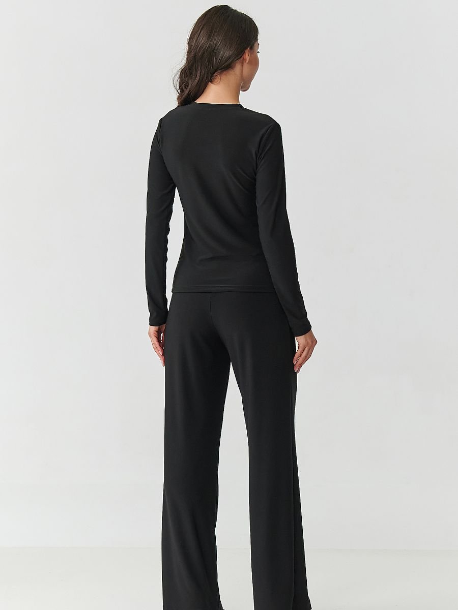 Postaw na elegancję w nowoczesnym wydaniu! Ten czarny komplet damski to połączenie wygody i ponadczasowego stylu. Składa się z dopasowanej bluzki z długim rękawem oraz spodni z szerokimi nogawkami, tworząc spójną, szykowną całość. Bluzka z subtelnymi, transparentnymi wstawkami na dekolcie i rękawach dodaje lekkości oraz zmysłowego charakteru a okrągły dekolt delikatnie podkreśla szyję i ramiona jednocześnie zapewniając wygodę w codziennym noszeniu. Spodnie mają wysoki stan, który pięknie podkreśla talię i wydłuża sylwetkę. Nogawki są szerokie i luźno opadające, co dodaje całości lekkości i sprawia, że spodnie są niezwykle wygodne w noszeniu. Czarny kolor to klasyka, która nigdy nie wychodzi z mody ? optycznie wysmukla sylwetkę i dodaje elegancji. Ten czarny komplet damski to must-have w garderobie każdej kobiety, która lubi wyglądać modnie, a jednocześnie czuć się swobodnie. Zestaw go z ulubionymi szpilkami lub botkami, a stworzysz look, który zachwyci w każdej sytuacji.