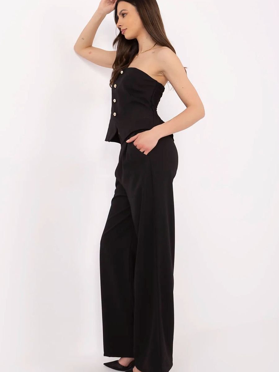 Stylowy komplet damski składający się z kamizelki i spodni to doskonały wybór dla kobiet ceniących elegancję z nutą nowoczesności. Idealny na co dzień, do pracy, na wizytowe okazje czy imprezy, sprawdzi się wszędzie tam, gdzie liczy się styl i wygoda. Kamizelka bez rękawów, z hiszpańskim dekoltem, ozdobiona została dekoracyjnymi guzikami z przodu oraz efektownymi marszczeniami na plecach, które nadają sylwetce subtelnej lekkości i podkreślają kobiecą linię. Spodnie z wysokim stanem i szerokimi nogawkami optycznie wydłużają nogi i pięknie układają się w ruchu. Wsuwane boczne kieszenie dodają im funkcjonalności, nie zaburzając jednocześnie eleganckiego charakteru zestawu. Wykonany z gładkiego materiału, połączenia poliestru i elastanu, komplet gwarantuje wygodę i styl przez cały dzień.
