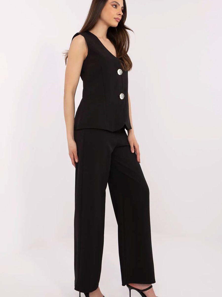 Elegancki komplet damski składający się z kamizelki i spodni, idealny na wizytowe okazje, do pracy lub na imprezę. Wykonany z wysokiej jakości poliestru i elastanu, materiał ten zapewnia wygodę i trwałość, a jednocześnie nadaje całości subtelną elegancję. Komplet doskonale łączy komfort z profesjonalnym stylem, sprawiając, że jest to idealny wybór na bardziej formalne wyjścia. Kamizelka z dekoltem w serek, zapinana na guziki, doskonale komponuje się z szerokimi, długimi nogawkami spodni o wysokim stanie. Spodnie mają boczne wsuwane kieszenie, które dodają praktyczności i nowoczesnego charakteru. Gładki wzór sprawia, że komplet jest ponadczasowy i bardzo uniwersalny. Idealny na eleganckie spotkania, do biura lub na wieczorne wyjścia, zapewniając wygodę i szyk w każdej sytuacji.