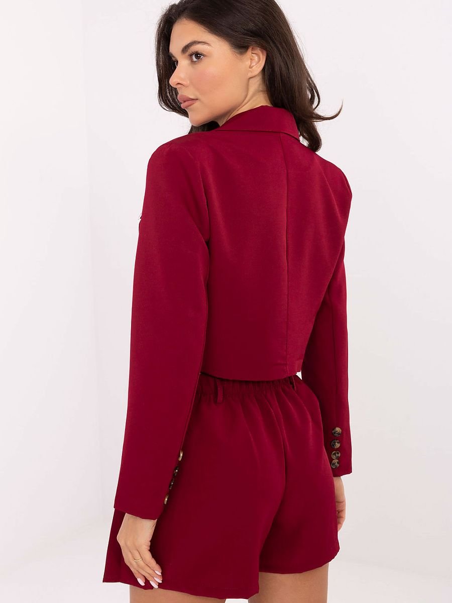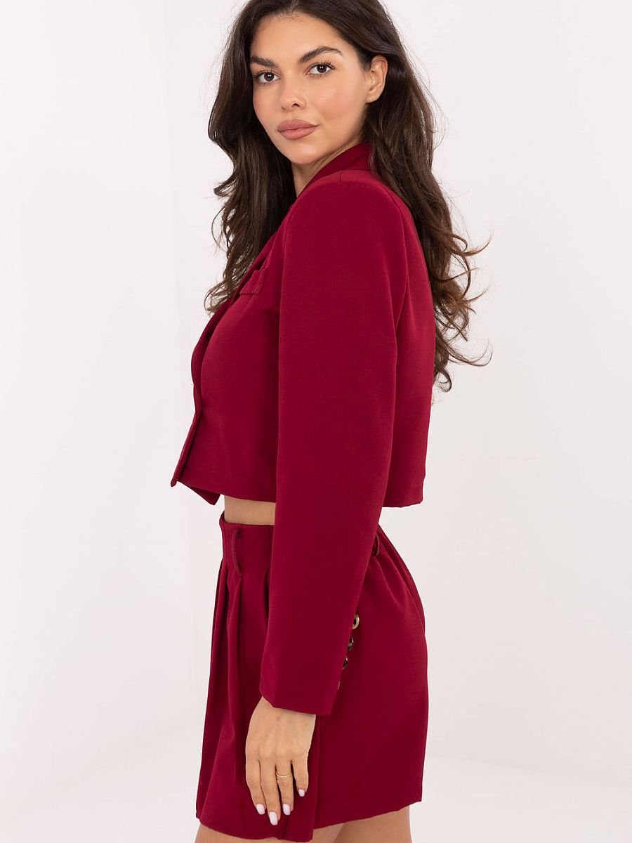 Damski komplet elegancki składający się z krótkiej marynarki i spódnicospodenek, idealny na codzienne wyjścia, do pracy i spotkania wizytowe. Marynarka z wykładanymi klapami, zapinana na guzik, z wszytymi poduszkami na ramionach. Spódnicospodenki posiadają plisowany przód i wszyte szorty, które zapewniają komfort i pełną swobodę ruchów, oraz wszyta gumę z tyłu dla lepszego dopasowania. Wykonany z mieszanki poliestru i elastanu, z gładkim wzorem, zestaw łączy elegancję z wygodą noszenia. Długi rękaw marynarki i mini długość spódnicospodenek nadają stylizacji nowoczesny i kobiecy charakter. To komplet, który łączy elegancję, funkcjonalność i komfort, doskonale sprawdzając się w wielu codziennych i wizytowych stylizacjach.