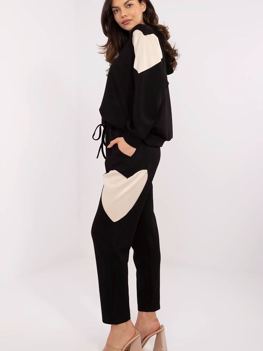 Komplet dresowy damski to idealne połączenie wygody i stylu na co dzień. Składa się z bluzy z kapturem oraz spodni z wysokim stanem, które doskonale dopasowują się do sylwetki. W pasie znajduje się praktyczne wiązanie, umożliwiające regulację obwodu. Zarówno bluza, jak i spodnie mają prosty, minimalistyczny krój, który sprawdzi się w casualowych stylizacjach. Długie nogawki oraz rękawy zapewniają komfort noszenia, a boczne wsuwane kieszenie dodają funkcjonalności. Wykonany z mieszanki poliestru, bawełny i elastanu materiał jest miękki, przyjemny w dotyku i dobrze układa się na ciele. Gładki wzór urozmaicają subtelne naszywki w kształcie serca umieszczone na rękawach oraz nogawkach, nadając całości wyjątkowego charakteru. To doskonały wybór na codzienne aktywności, relaks w domu czy spacer.