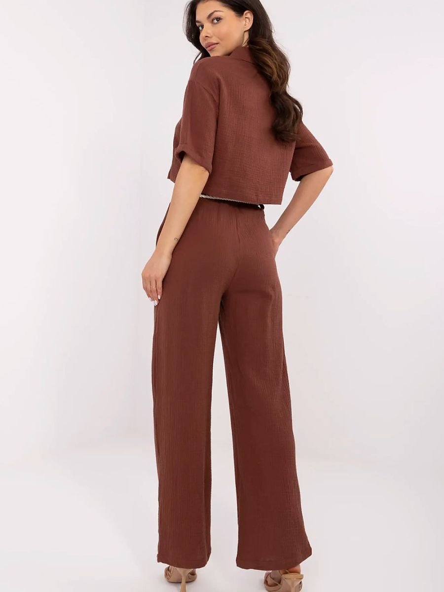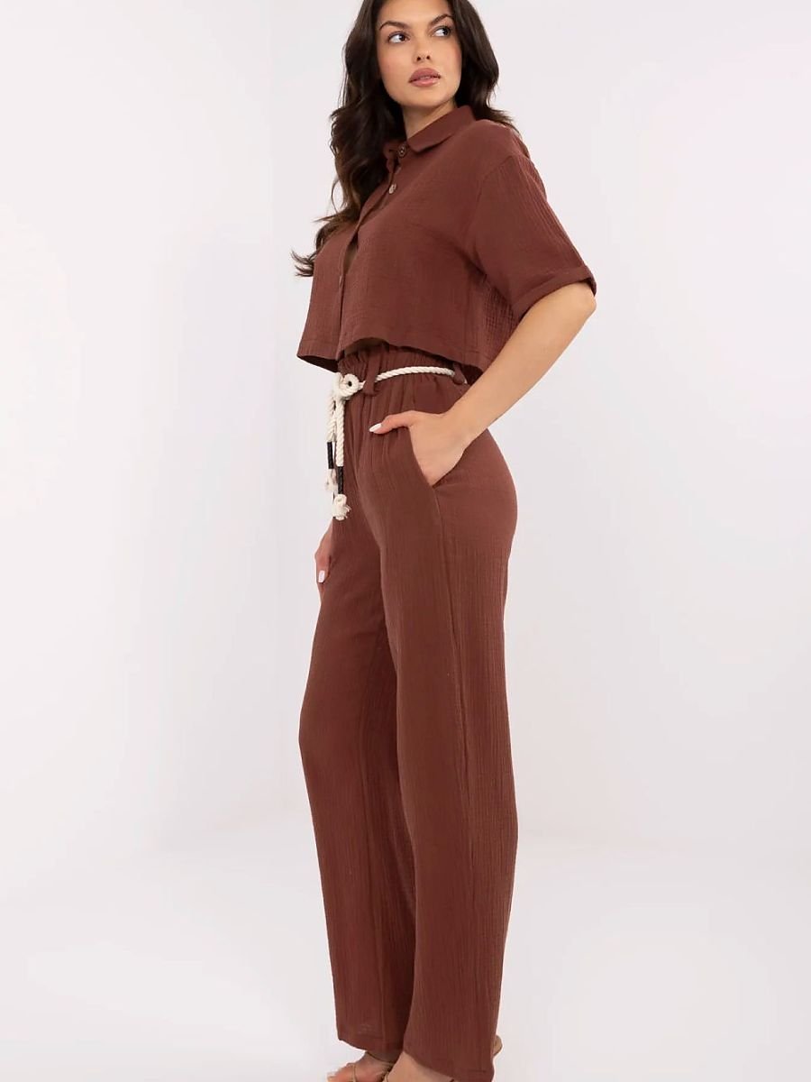 Damski komplet z koszulą i spodniami to stylowa i wygodna propozycja w casualowym wydaniu, idealna na co dzień. Wykonany z przewiewnej i naturalnej mieszanki lnu i wiskozy, zapewnia komfort noszenia nawet w cieplejsze dni. W zestawie znajduje się koszula z krótkim rękawem, klasycznym kołnierzykiem i zapięciem na guziki, która prezentuje się lekko i ponadczasowo. Spodnie z wysokim stanem, o prostych nogawkach, zostały wyposażone w wsuwane kieszenie boczne oraz pasek do wiązania w talii, który podkreśla sylwetkę i dodaje kobiecego akcentu. Gładka tkanina i minimalistyczny krój sprawiają, że komplet jest niezwykle uniwersalny, świetnie sprawdzi się na spacer, zakupy czy swobodny dzień w pracy. Naturalny look i luz w modnym wydaniu!