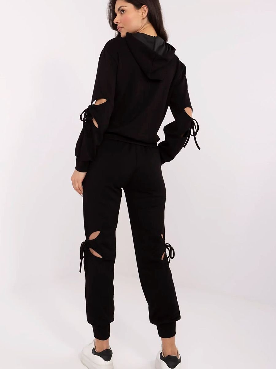 Casualowy komplet dresowy to idealne połączenie wygody i modnego stylu. Wykonany z miękkiej mieszanki wiskozy, poliestru i elastanu, zapewnia komfort noszenia i swobodę ruchów. Bluza z kapturem ma długi rękaw oraz subtelne rozcięcia na rękawach z ozdobnymi wiązaniami, które nadają całości oryginalnego charakteru. Spodnie z wysokim stanem i wsuwanymi bocznymi kieszeniami gwarantują wygodę, a ściągacze przy nogawkach podkreślają sportowy styl. Dodatkowym atutem są rozcięcia na nogawkach z ozdobnymi wiązaniami, które nadają niebanalnego wyglądu. Elastyczny pas z wiązaniem pozwala na idealne dopasowanie. To doskonały wybór na co dzień dla kobiet ceniących komfort i modowy akcent w stylizacjach. Komplet wykonany z materiał typu masełko, wyjątkowo miękki, przyjemny w dotyku, doskonale dopasowujący się do ciała.