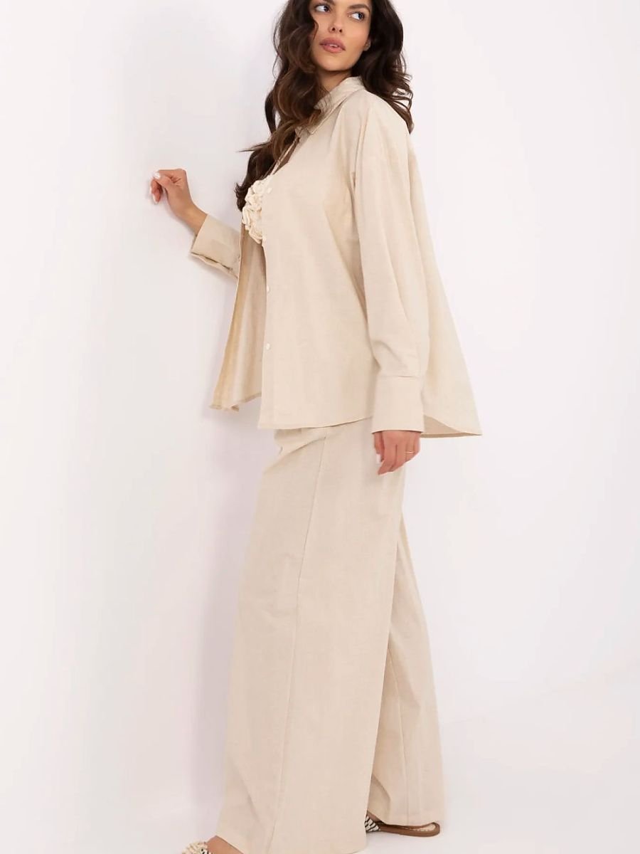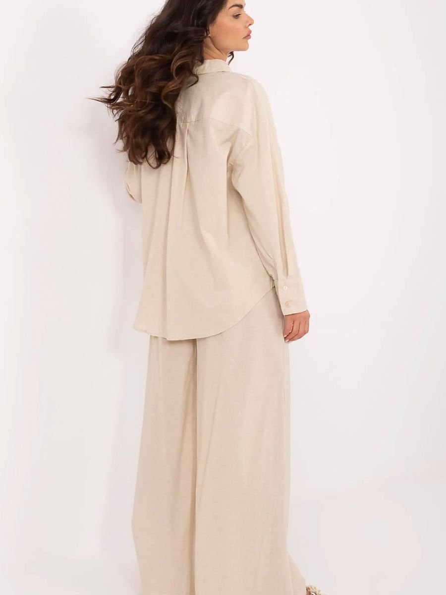 Stylowy i wygodny komplet damski, idealny na codzienne stylizacje. Wykonany z przewiewnej mieszanki bawełny i lnu, zapewnia lekkość, komfort noszenia oraz naturalny wygląd. Koszula o dłuższym kroju zapinana na guziki z klasycznym kołnierzykiem nadaje całości eleganckiego, ale swobodnego charakteru. Długi rękaw dodaje stylu i funkcjonalności. Spodnie z wysokim stanem oraz szerokimi nogawkami zapewniają swobodę ruchu i modny wygląd, a elastyczna guma w pasie gwarantuje idealne dopasowanie. Dodatkowym atutem są praktyczne boczne kieszenie wsuwane. To doskonały wybór dla kobiet ceniących połączenie wygody z nowoczesnym, casualowym stylem.