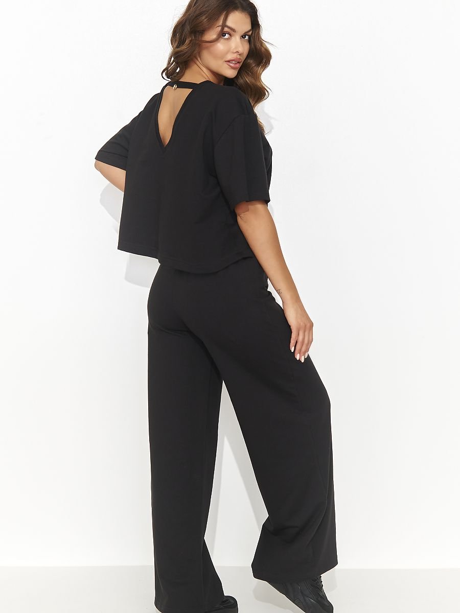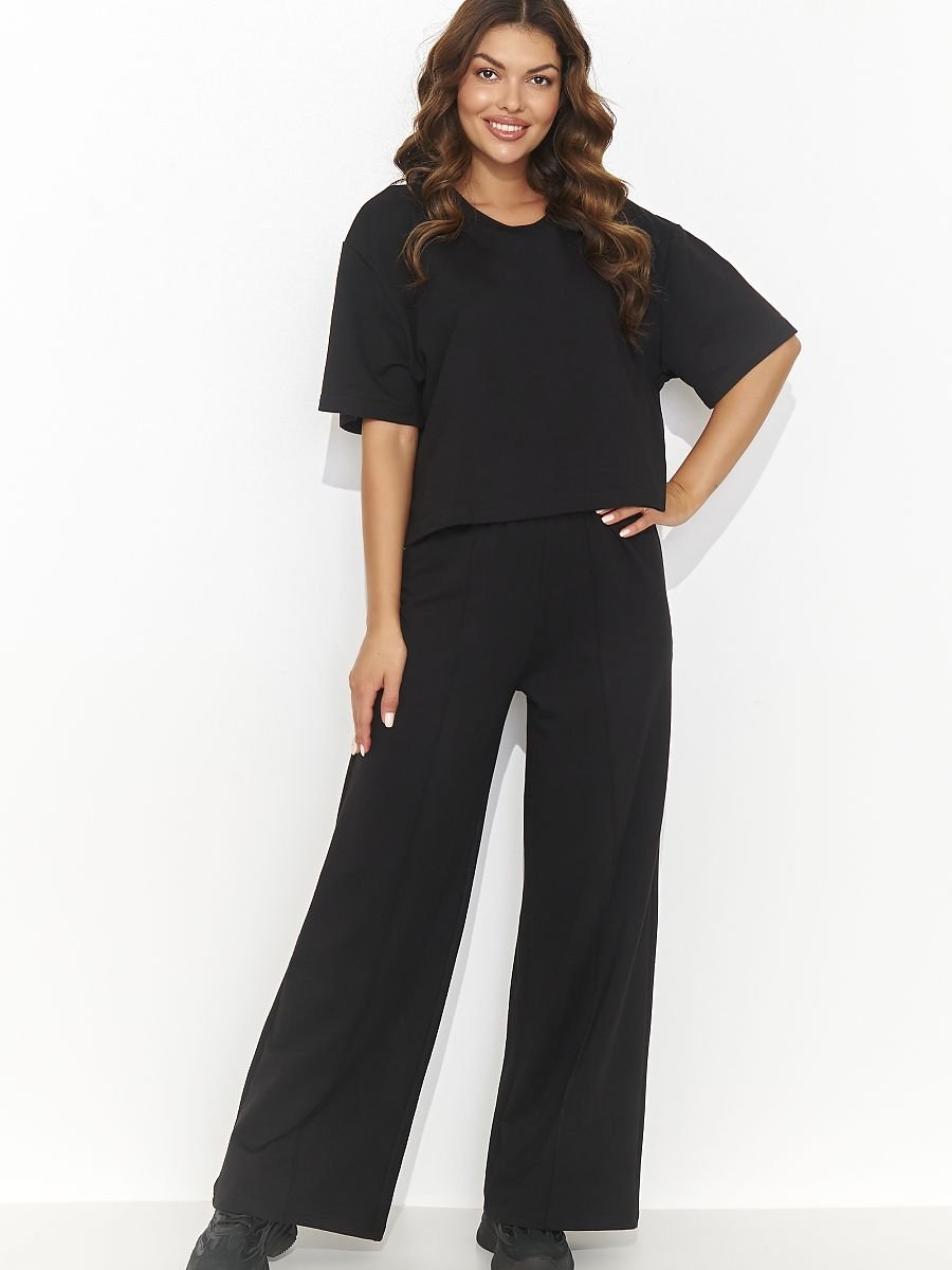 Ten stylowy damski komplet dresowy to połączenie wygody i elegancji. Składa się ze swobodnej koszulki z krótkim rękawem, która z tyłu posiada efektowne wycięcie zdobione złotą blaszką, dodającą subtelnej elegancji. Dopełnieniem zestawu są swobodne długie spodnie z szeroką nogawką, ozdobione przeszyciami na całej długości, co nadaje im nowoczesnego charakteru. Komplet dostępny jest w trzech modnych kolorach, co pozwala na wybór odpowiedniego odcienia zgodnie z preferencjami. To doskonałe rozwiązanie dla kobiet ceniących stylowe i komfortowe ubrania na co dzień, idealne zarówno do relaksu, jak i aktywnego trybu życia.