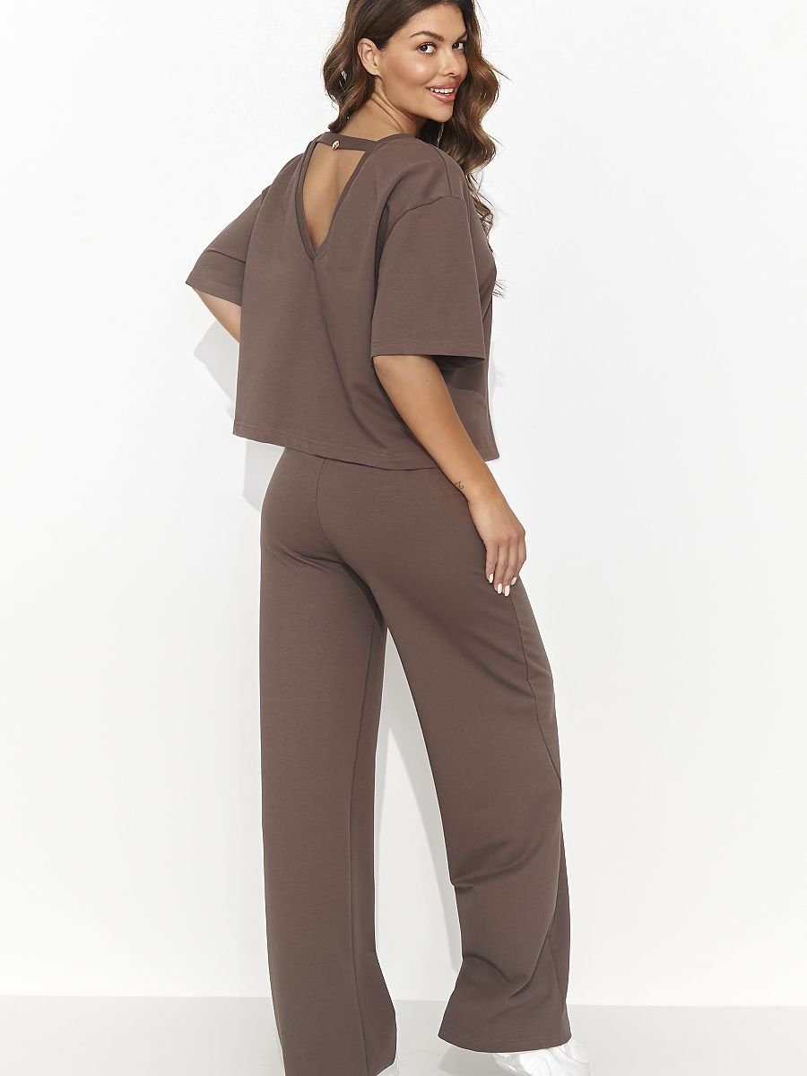 Ten stylowy damski komplet dresowy to połączenie wygody i elegancji. Składa się ze swobodnej koszulki z krótkim rękawem, która z tyłu posiada efektowne wycięcie zdobione złotą blaszką, dodającą subtelnej elegancji. Dopełnieniem zestawu są swobodne długie spodnie z szeroką nogawką, ozdobione przeszyciami na całej długości, co nadaje im nowoczesnego charakteru. Komplet dostępny jest w trzech modnych kolorach, co pozwala na wybór odpowiedniego odcienia zgodnie z preferencjami. To doskonałe rozwiązanie dla kobiet ceniących stylowe i komfortowe ubrania na co dzień, idealne zarówno do relaksu, jak i aktywnego trybu życia.
