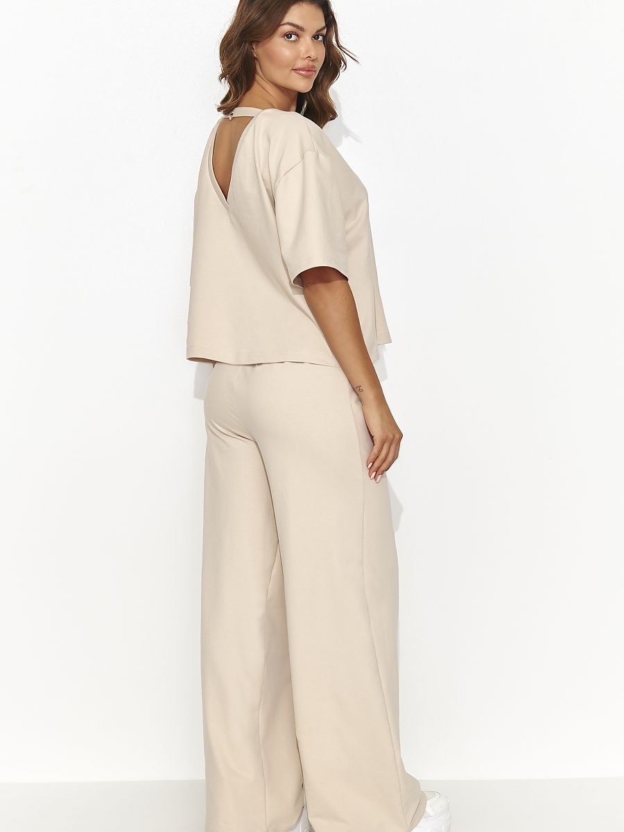 Ten stylowy damski komplet dresowy to połączenie wygody i elegancji. Składa się ze swobodnej koszulki z krótkim rękawem, która z tyłu posiada efektowne wycięcie zdobione złotą blaszką, dodającą subtelnej elegancji. Dopełnieniem zestawu są swobodne długie spodnie z szeroką nogawką, ozdobione przeszyciami na całej długości, co nadaje im nowoczesnego charakteru. Komplet dostępny jest w trzech modnych kolorach, co pozwala na wybór odpowiedniego odcienia zgodnie z preferencjami. To doskonałe rozwiązanie dla kobiet ceniących stylowe i komfortowe ubrania na co dzień, idealne zarówno do relaksu, jak i aktywnego trybu życia.