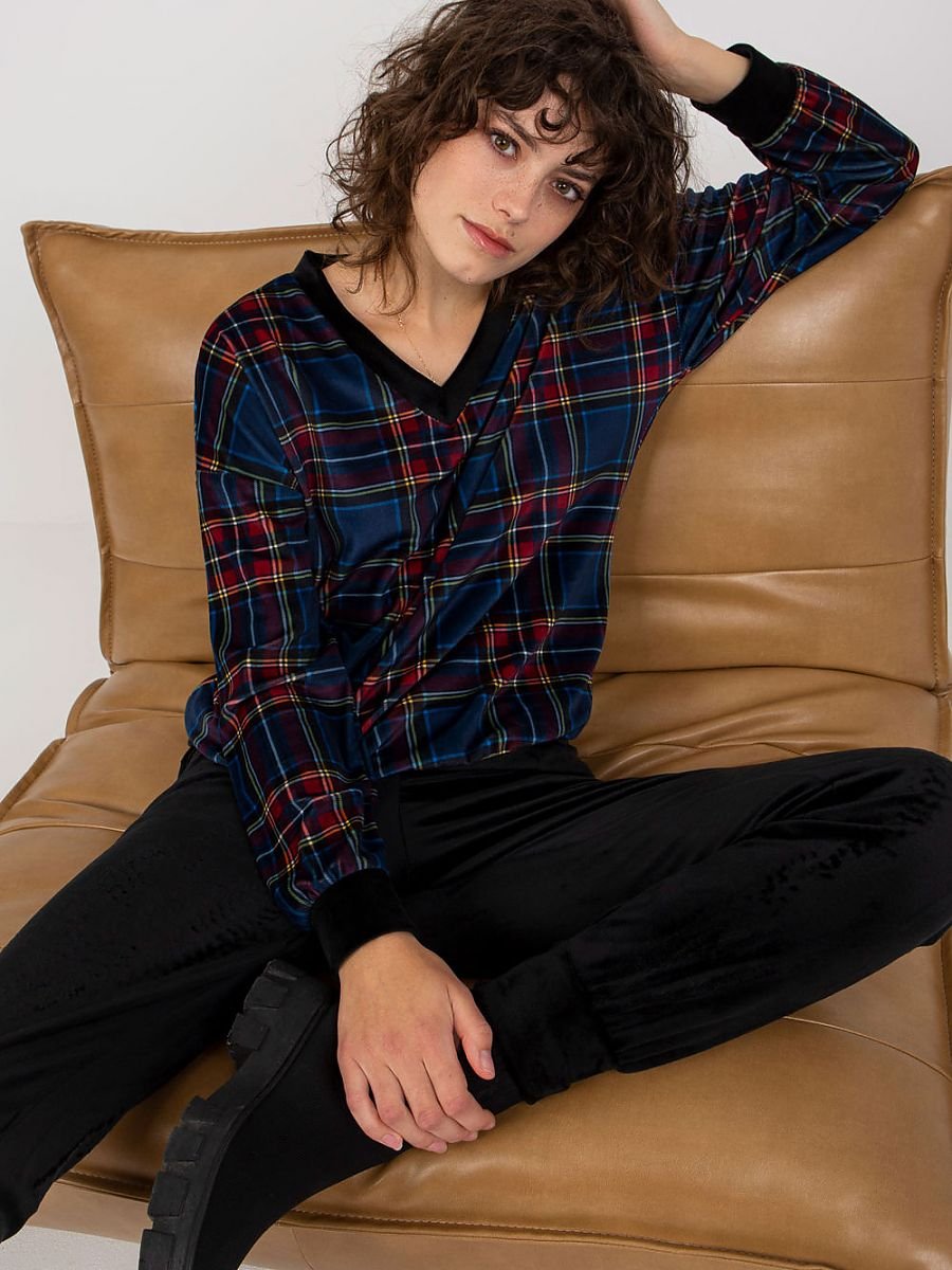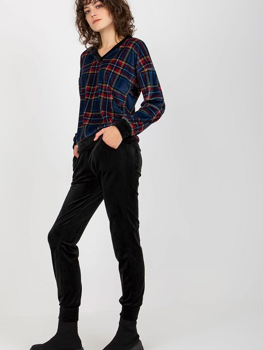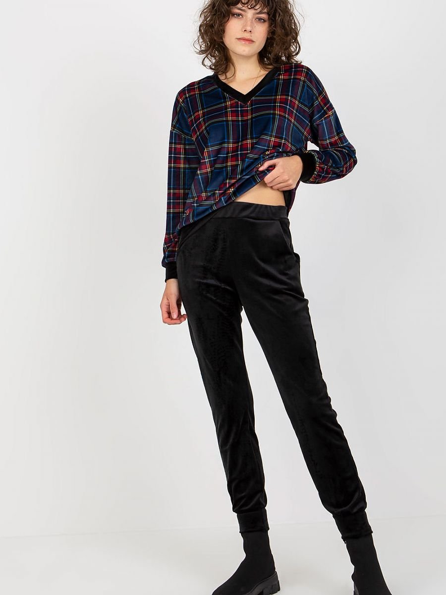 Welurowy komplet damski składający się z bluzy oraz spodni. Bluza z długim rękawem z materiału w ciekawą kratę. Długie czarne spodnie z kieszeniami wsuwanymi.