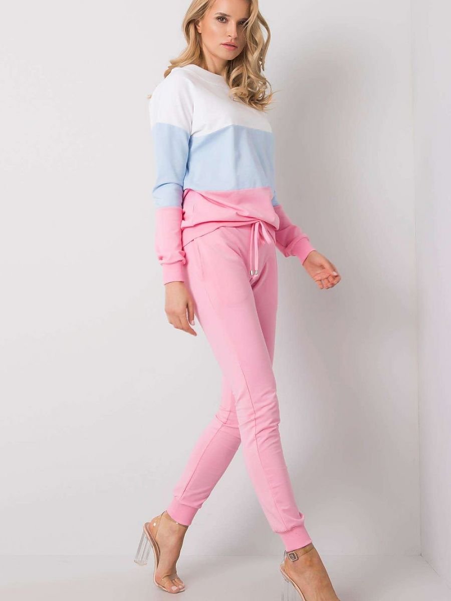 Komplet dresowy składający się z bluzy i spodni. Bluza z długim rękawem oraz okrągłym dekoltem. Bluza wykonana z tkaniny w trzech kolorach. Długie spodnie z gumką w pasie, troczkami do wiązania oraz kieszeniami wsuwanymi.