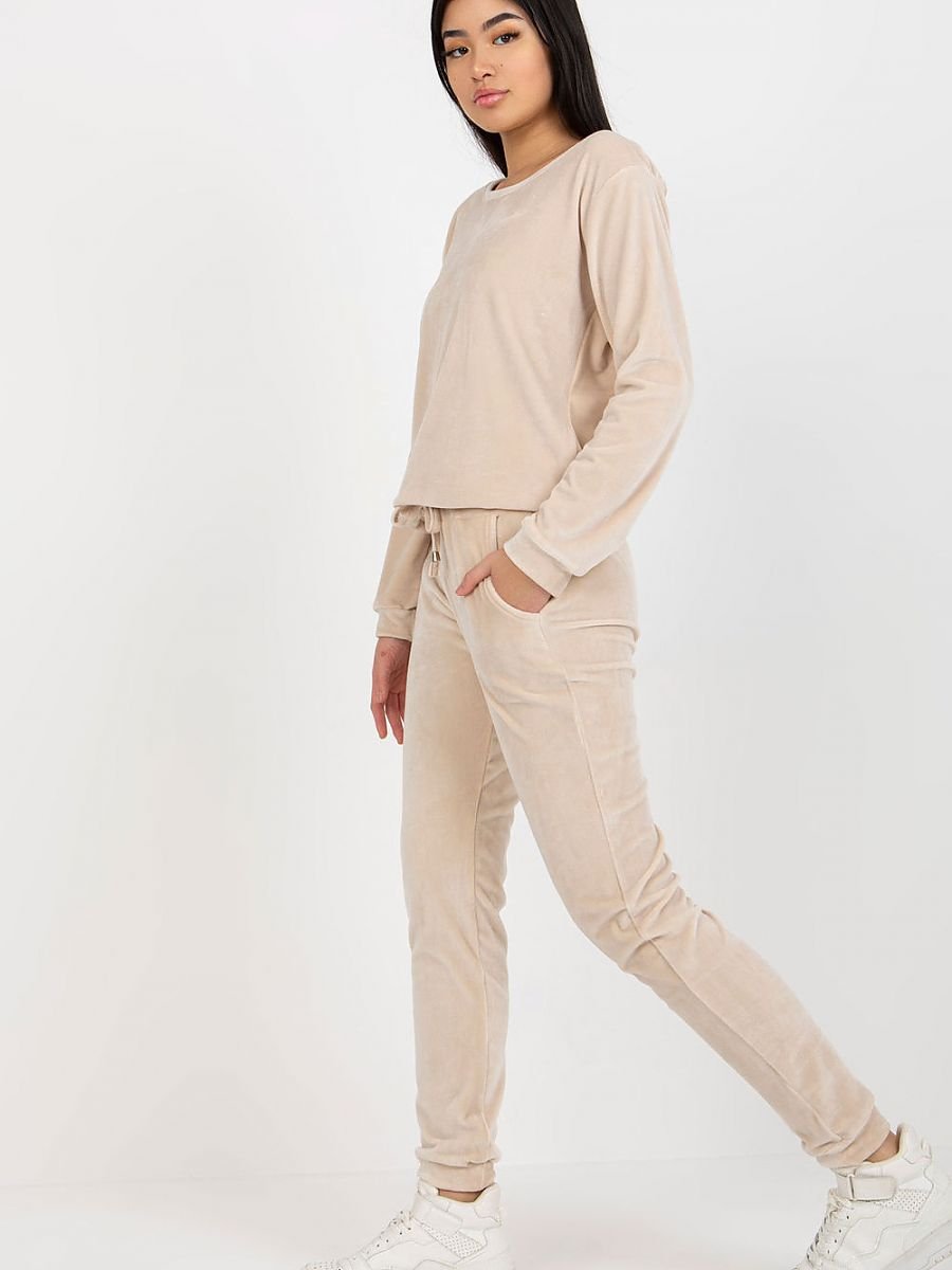 Welurowy komplet składający się z bluzy oraz spodni. Bluza z długim rękawem oraz okrągłym dekoltem. Długie spodnie z wiązaniem w pasie oraz kieszeniami wsuwanymi.