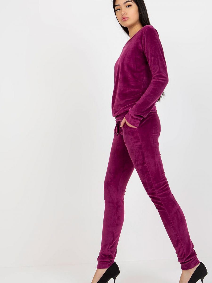 Welurowy komplet składający się z bluzy oraz spodni. Bluza z długim rękawem oraz okrągłym dekoltem. Długie spodnie z wiązaniem w pasie oraz kieszeniami wsuwanymi.
