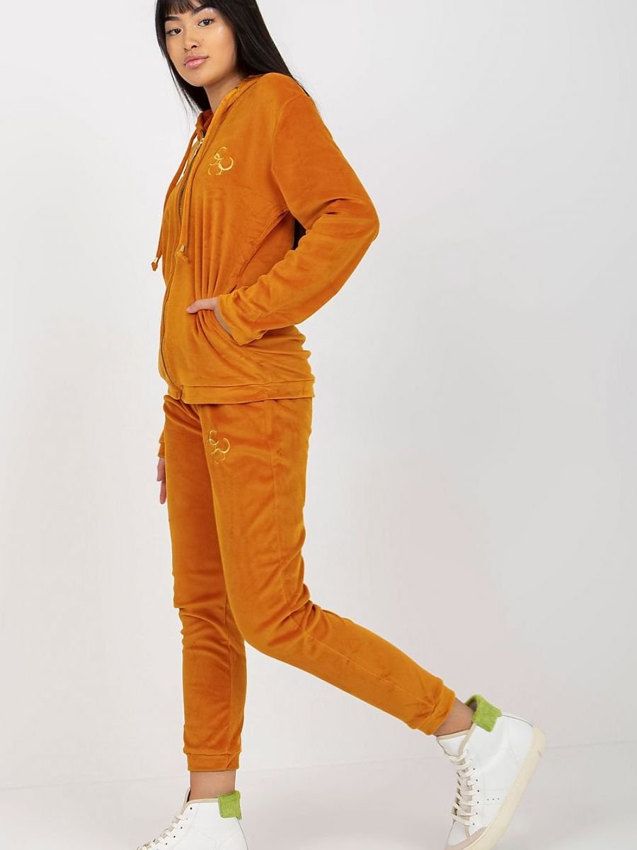 Komplet welurowy składający się z bluzy oraz spodni. Bluza zapinana na zamek, z długim rękawem, kapturem oraz kieszeniami wsuwanymi. Długie spodnie z wiązaniem w pasie, po bokach kieszenie wsuwane.