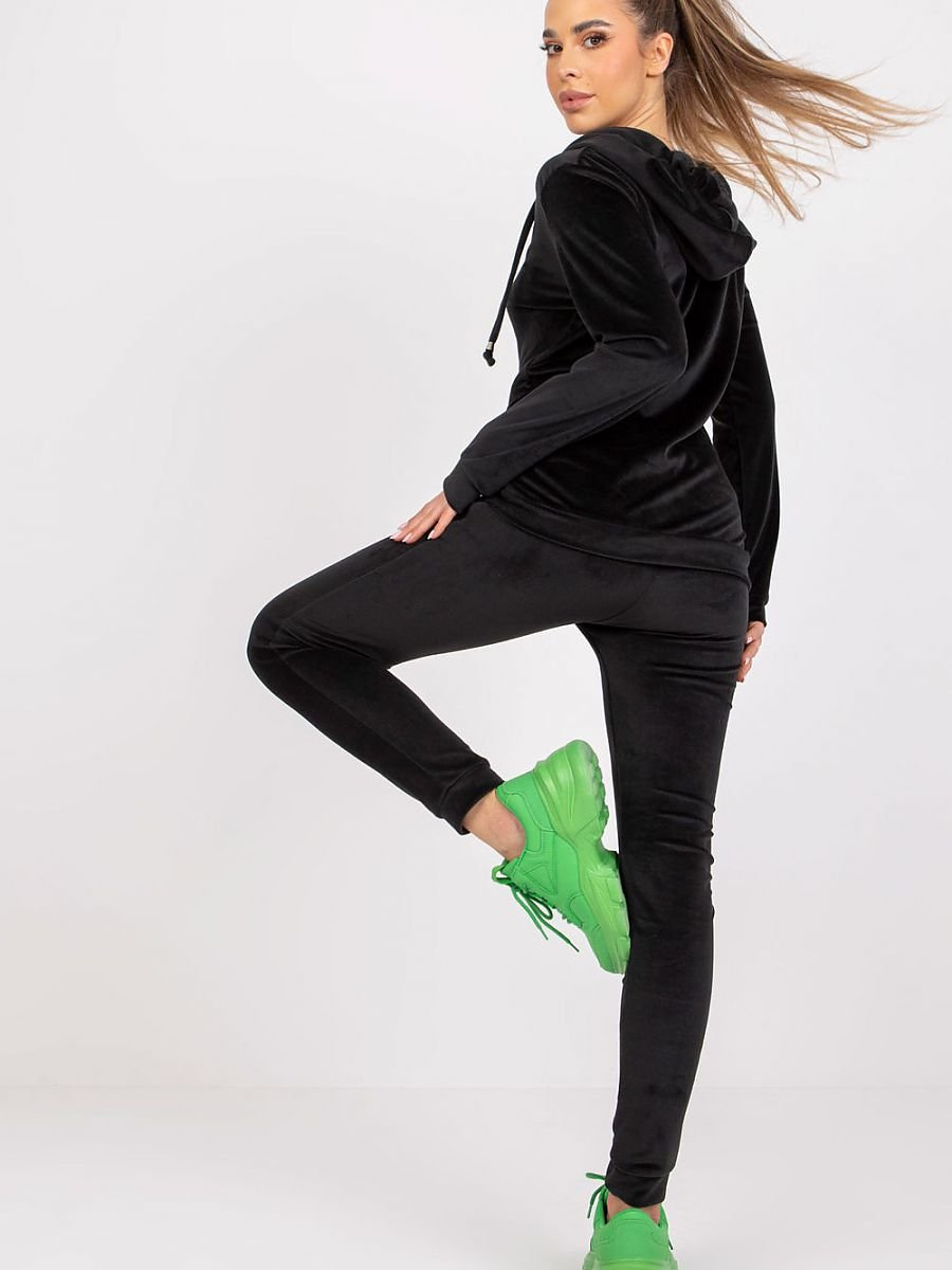 Komplet welurowy składający się z bluzy i długich spodni. Bluza z długim rękawem oraz kapturem, zapinana na zamek. Na przodzie kieszenie wsuwane. Długie spodnie z wiązaniem w pasie, po bokach kieszenie wsuwane.