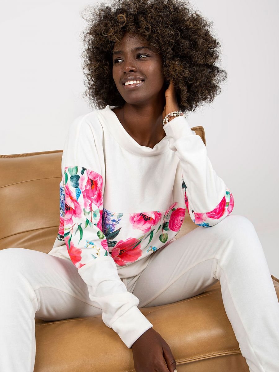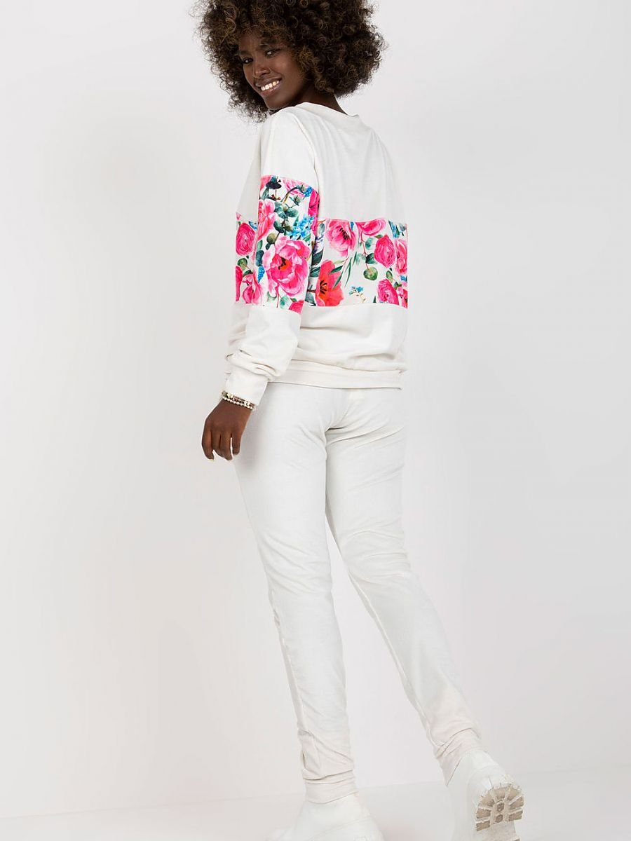 Komplet składający się z bluzy i długich spodni. Bluza z długim rękawem oraz okrągłym dekoltem. Długie spodnie z wiązaniem i kieszeniami bocznymi.