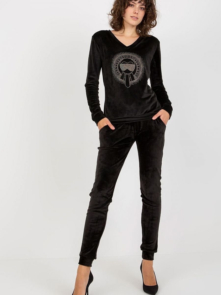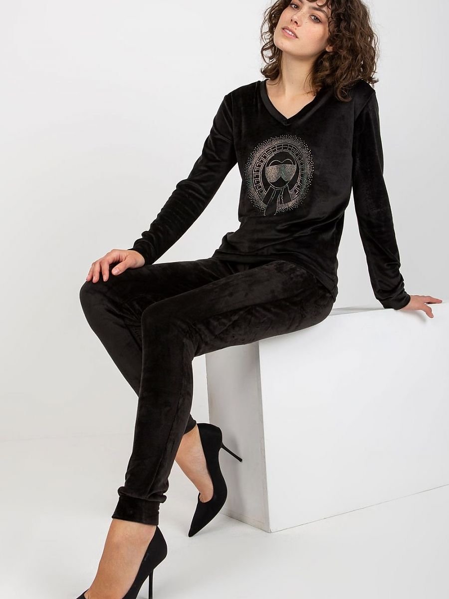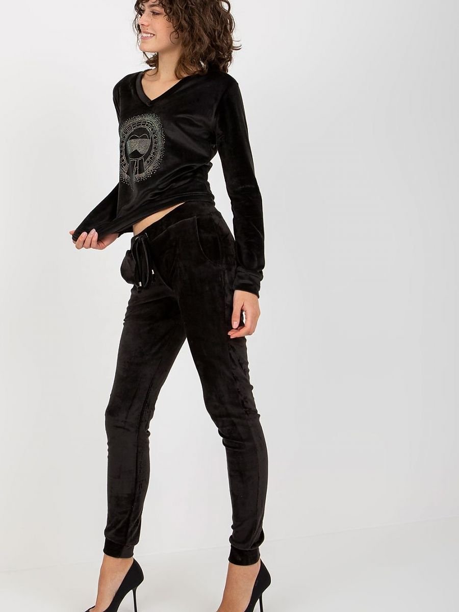 Welurowy komplety składający się z bluzy oraz spodni. Bluza z długim rękawem oraz dekoltem w serek. Długie spodnie z wiązaniem w pasie oraz kieszeniami wsuwanymi.