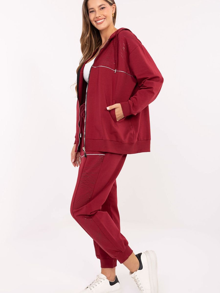 Komplet dresowy damski w stylu casual, idealny na codzienne okazje. Uszyty z bawełny z dodatkiem elastanu, zapewnia komfort noszenia i swobodę ruchów. Bluza zapinana na zamek posiada praktyczny kaptur oraz wsuwane kieszenie, a subtelny nadruk dodaje całości modnego charakteru. Spodnie o długich nogawkach zakończonych ściągaczami mają wysoki stan i regulację w pasie na wiązanie, co gwarantuje idealne dopasowanie. Boczne kieszenie wsuwane sprawiają, że komplet jest nie tylko wygodny, ale i funkcjonalny. To doskonały wybór dla kobiet, które cenią styl i wygodę w jednym.
