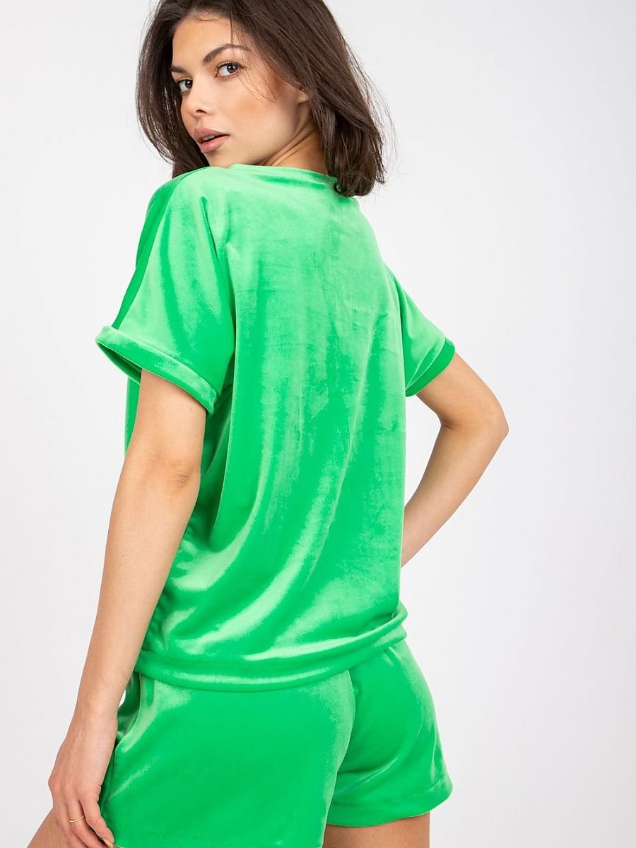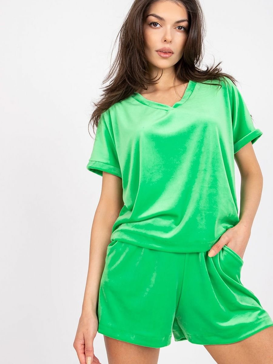 Komplet welurowy składający z bluzki oraz szortów. Bluzka z krótkim rękawkiem oraz dekoltem w serek. Szorty z wysokim stanem, w psie guma, po bokach kieszenie wsuwane.