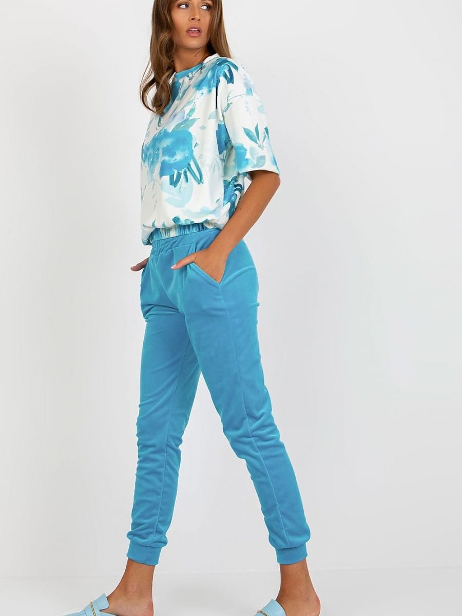 Welurowy komplet składający się z bluzki oraz spodni. Bluzka z krótkim rękawkiem oraz okrągłym dekoltem. Bluzka wykonana z materiału w ciekawy wzór. Długie spodnie z wysokim stanem, po bokach kieszenie wsuwane.