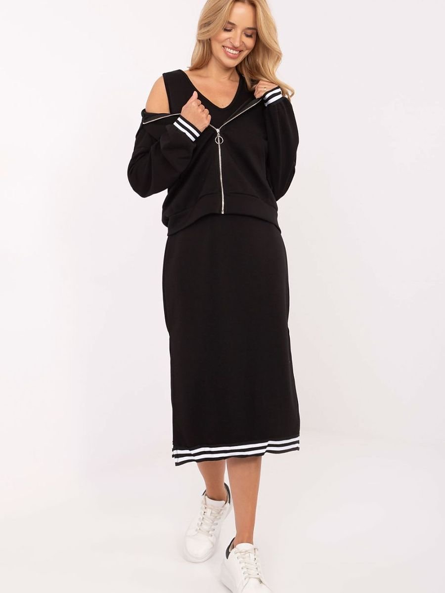 Komplet damski w stylu casual to idealna propozycja na co dzień, łącząca wygodę i kobiecy charakter. Wykonany z materiału typu masełko (wiskoza z dodatkiem elastanu) zachwyca swoją miękkością, delikatnością i wyjątkową przyjemnością w dotyku. Bluza z kapturem zapinana na zamek posiada długie rękawy, praktyczne wsuwane kieszenie oraz ozdobne ściągacze przy mankietach, które nadają całości sportowego akcentu. Sukienka z ozdobnym wykończeniem o długości midi, na grubych ramiączkach z dekoltem w serek, doskonale komponuje się z bluzą, tworząc spójną i modną stylizację. Komplet sprawdzi się w codziennych zestawach, gwarantując komfort i swobodę ruchów, a jednocześnie stylowy i nowoczesny wygląd.