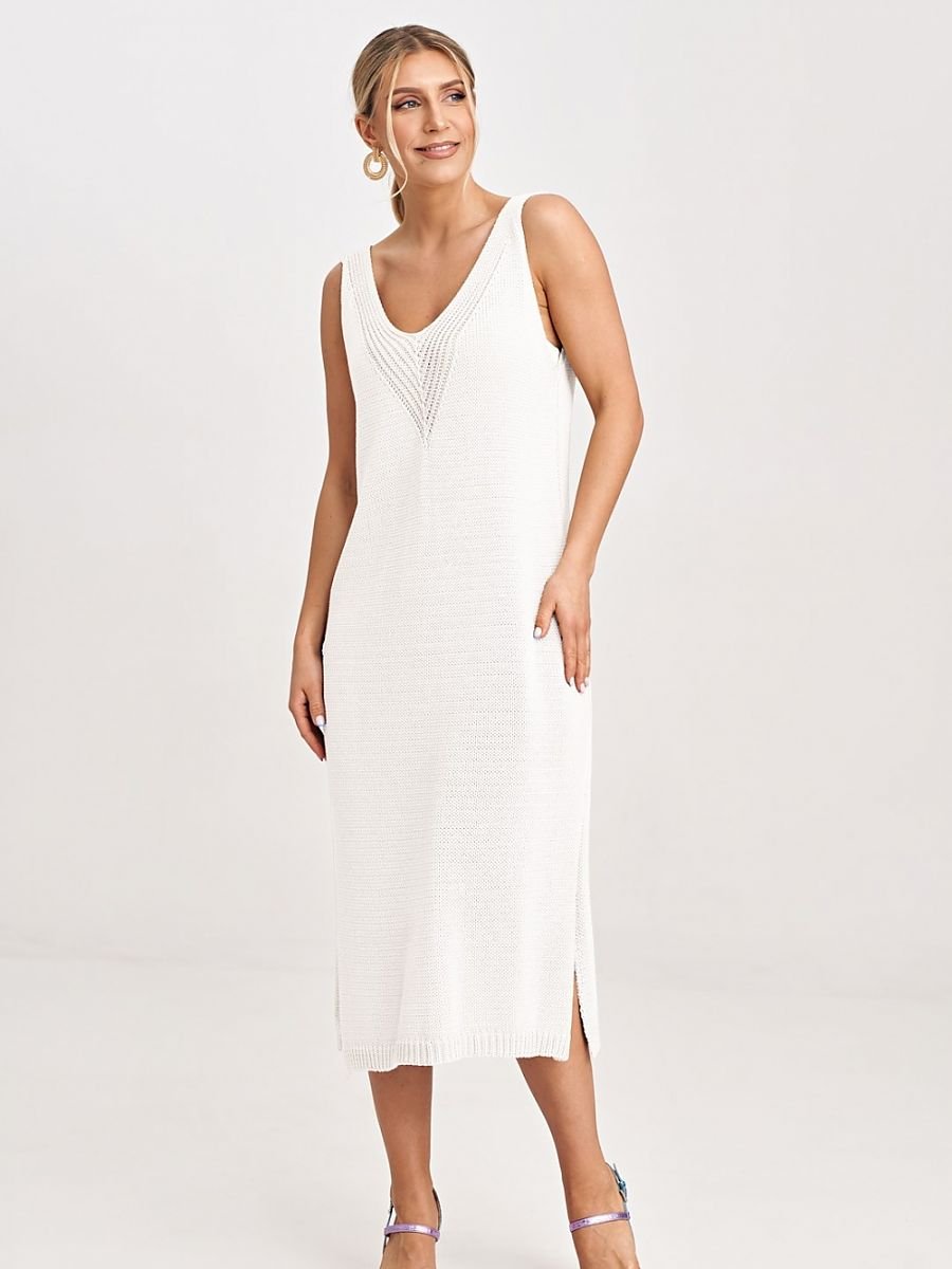 Komplet dwuczęściowy składający się z midi sukienki oraz bolerka. Bolerko z długim rękawem, niezapinane z ozdobną kokardą na przodzie. Sukienka na grubych ramiączkach oraz głębokim dekoltem.