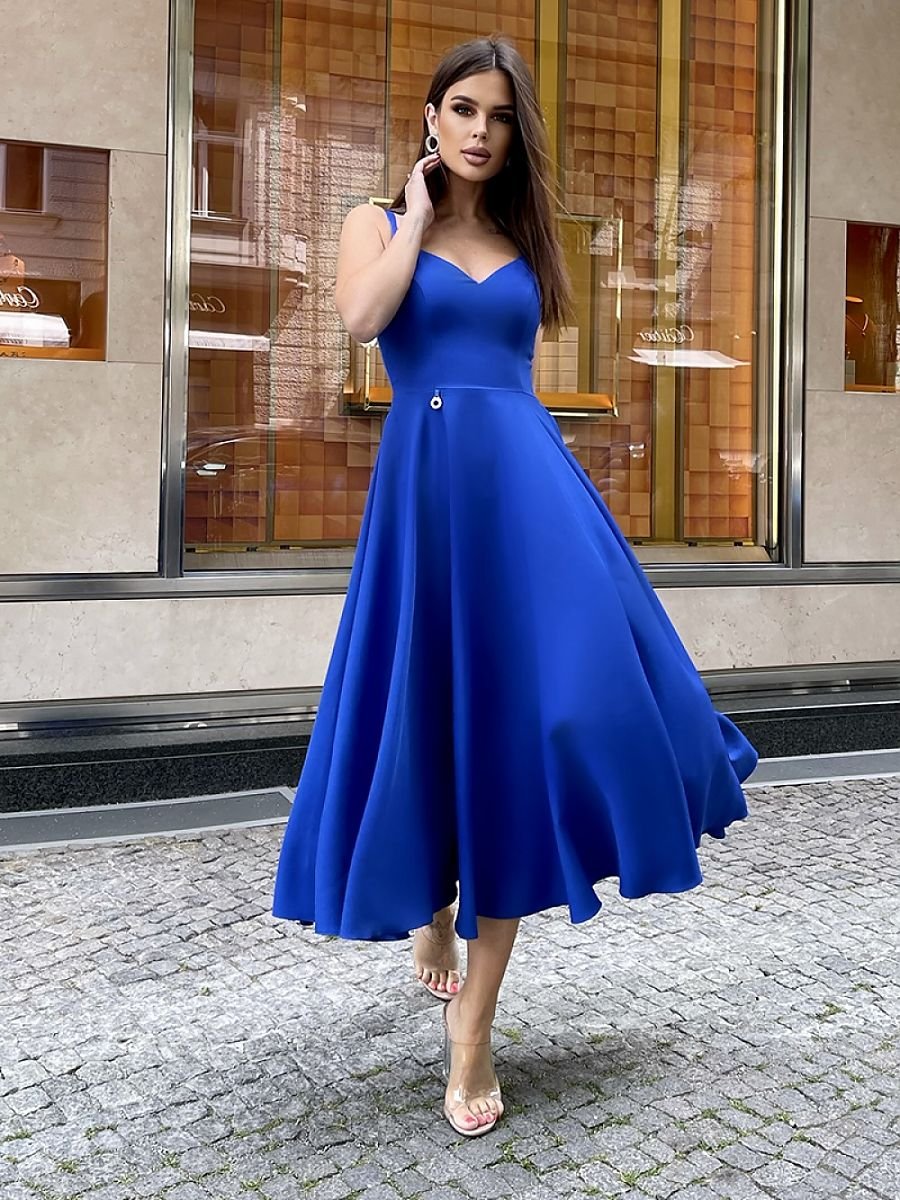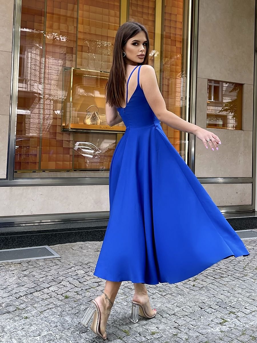 Sukienka midi na ramiączkach lekko rozkloszowana. Góra kreacji na cieniutkich ramiączkach, idealnie dopasowana w talii. Ramiona jak i plecy odsłonięte. Sukienka zapinana na kryty zamek, posiada podszewkę. Model dodający szyku i kobiecości. Dostępny w przeróżnych kolorach.