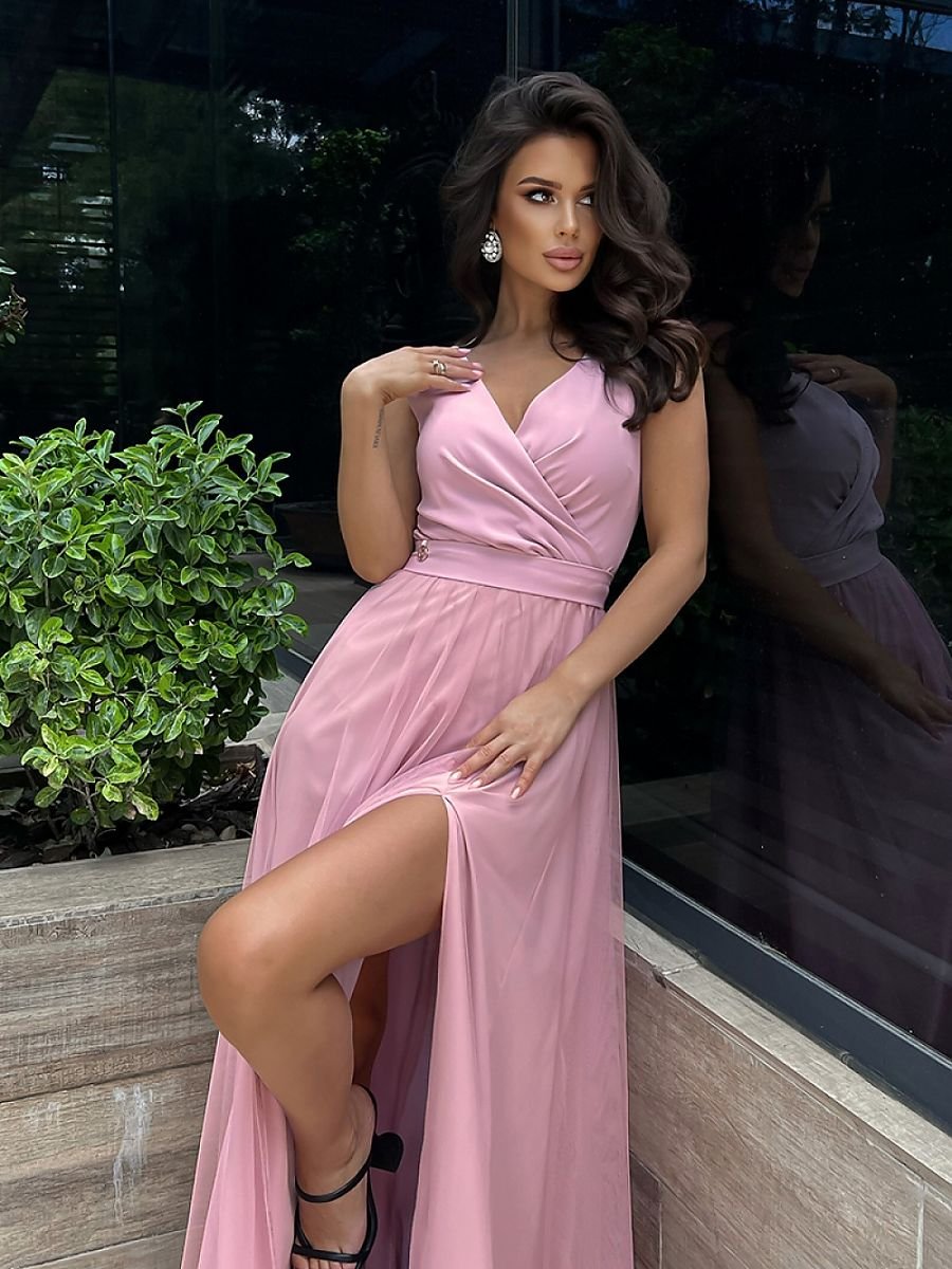 Piękna długa sukienka, niezwykle zgrabna, uszyta ze zwiewnej tkaniny. Góra z delikatnym dekoltem, dół dwuwarstwowy z wycięciem na nodze, dodającym kreacji powabności. Do sukienki dołączony pasek.