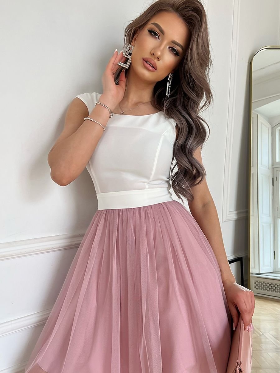 Sukienka z tiulową warstwową spódnicą uszyta w ciekawych wersjach kolorystycznych. Góra gładka dopasowana, zasuwana z tyłu na zamek. Do modelu dołączony jest pasek.