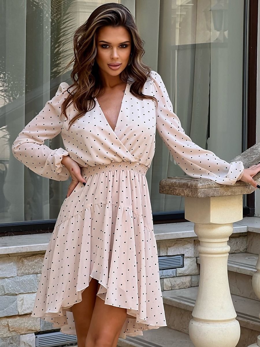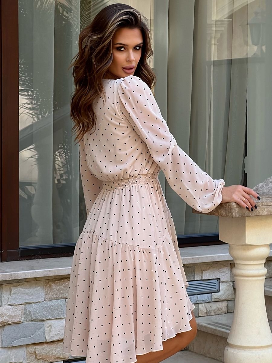 Piękna, zwiewna szyfonowa sukienka uszyta z materiału zdobionym pięknymi groszkami. Tył dłuższy, dodaje lekkości kreacji. Góra skrojona w serek z długimi rękawami wykończonymi gumką. Sukienka zapinana na kryty zamek, posiada podszewkę. Dostępna w modnej gamie kolorystycznej.