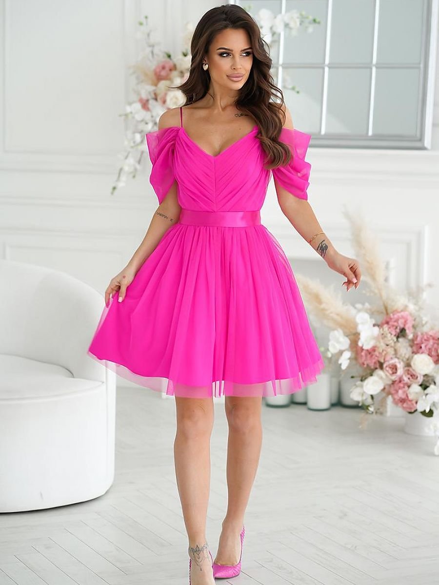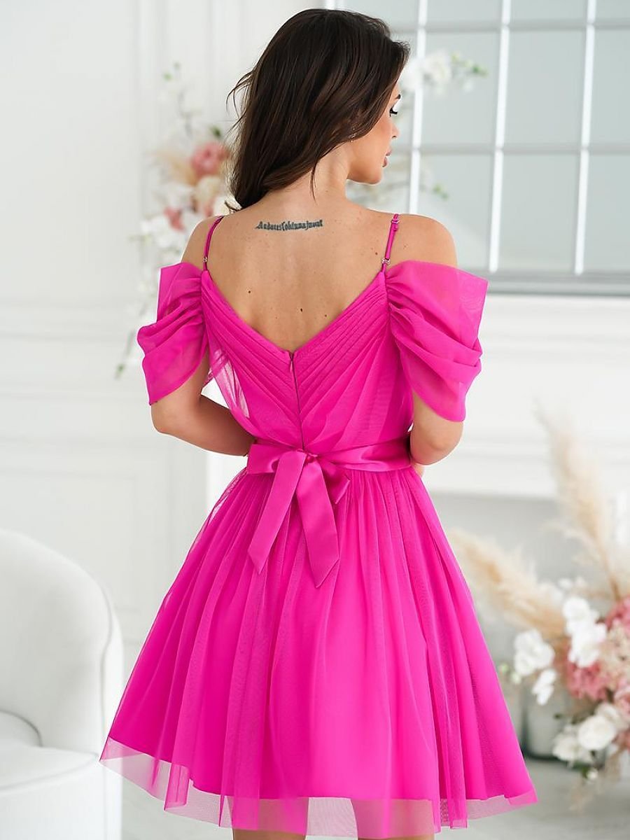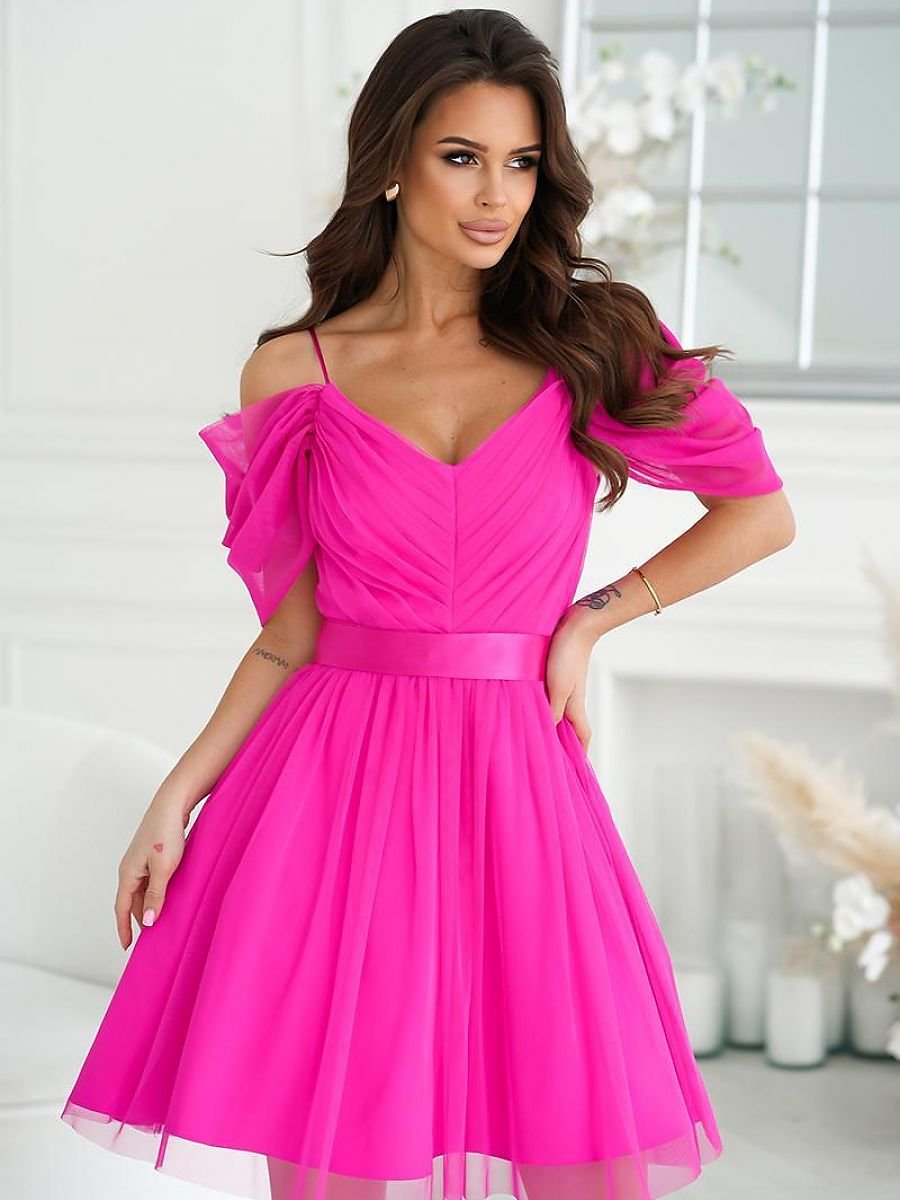 Piękna sukienka w stylu hiszpańskim z opadającymi tiulowymi rękawkami. Dół kreacji warstwowy, rozkloszowany, idealnie komponuje się z górą kreacji. Do modelu dołączony jest pasek. Sukienka zapinana na kryty zamek. Dostępna w soczystych kolorach.