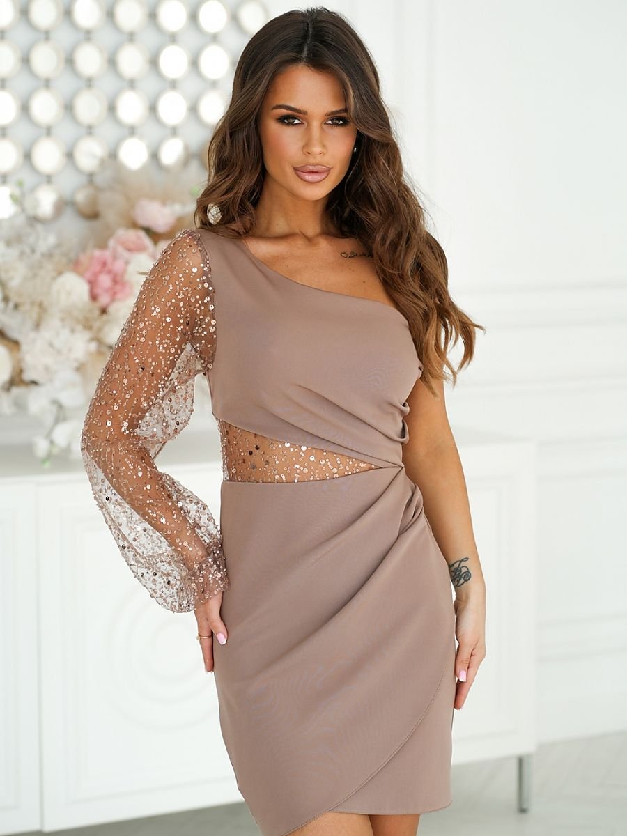 Mini sukienka z pięknym cekinowym rękawem na jedno ramię. Góra asymetryczna, również ze wstawką cekinową. Dół kreacji krótki, gładki i marszczony. Sukienka posiada podszewkę, zapinana na kryty zamek. Sukienka idealna na eleganckie imprezy.